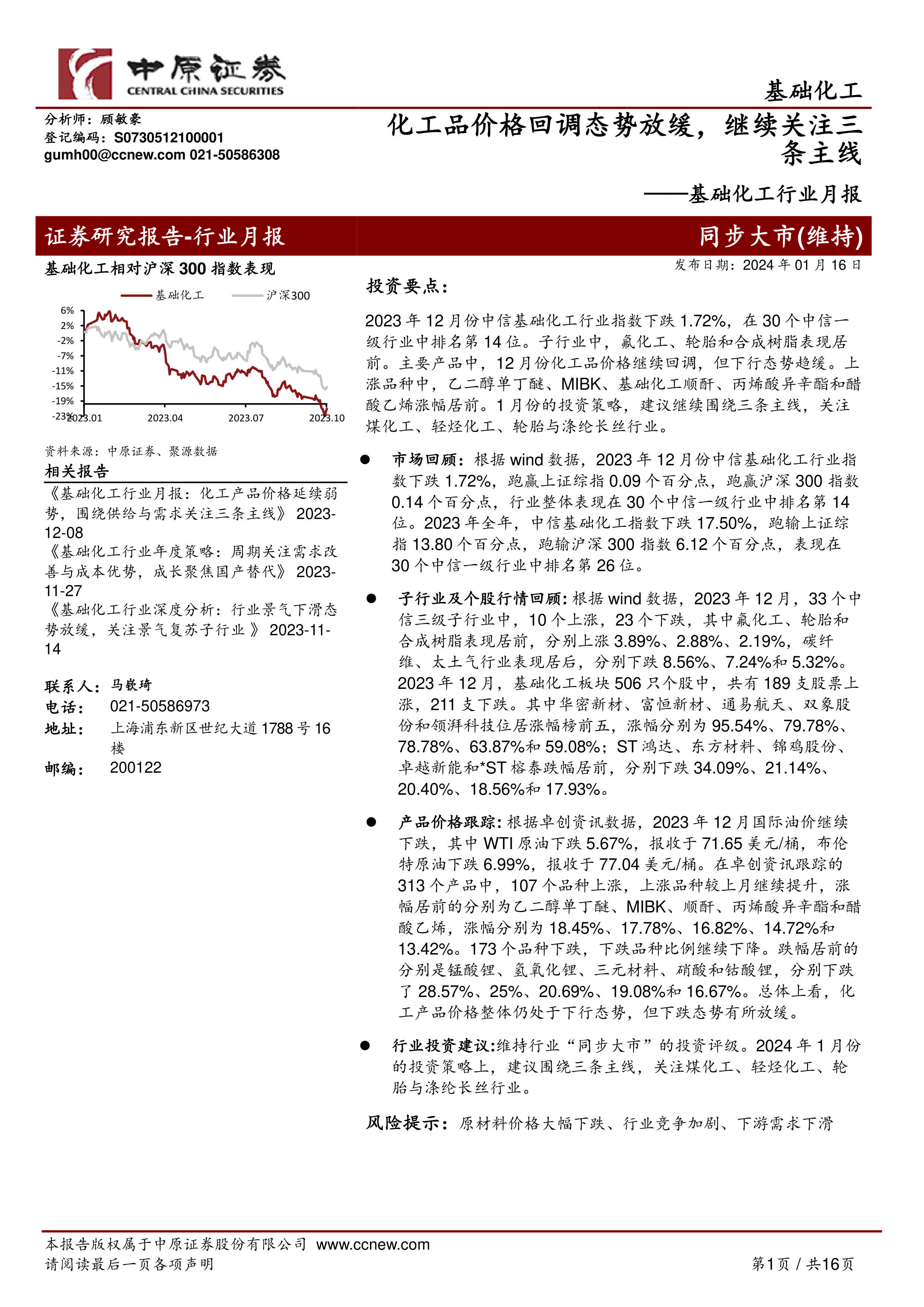 2023年12月,中信基础化工行业指数下跌1.72%,跑赢上证综指和沪深300指数,但全年下跌17.50%,跑输大盘。这表明行业整体表现虽然有所回暖,但仍面临挑战。