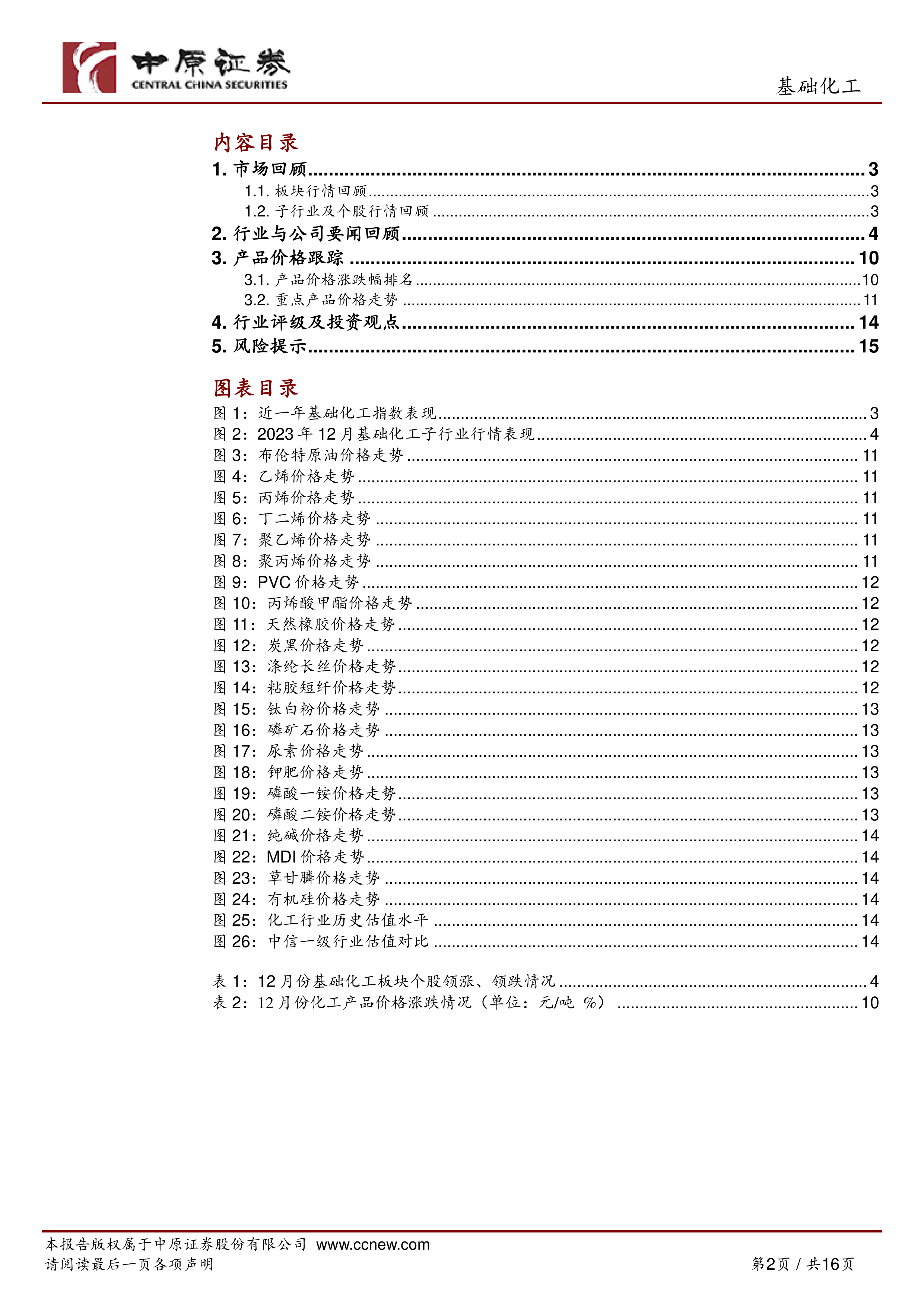 本报告的核心观点是:2023年12月,基础化工行业指数下跌1.72%,但下跌态势有所放缓,部分子行业和产品价格出现上涨。2024年1月,建议继续关注煤化工、轻烃化工、轮胎与涤纶长丝三条投资主线。 具体而言,报告分析了行业整体表现、子行业及个股行情、产品价格波动以及未来投资建议,并结合宏观经济形势和行业政策进行解读。