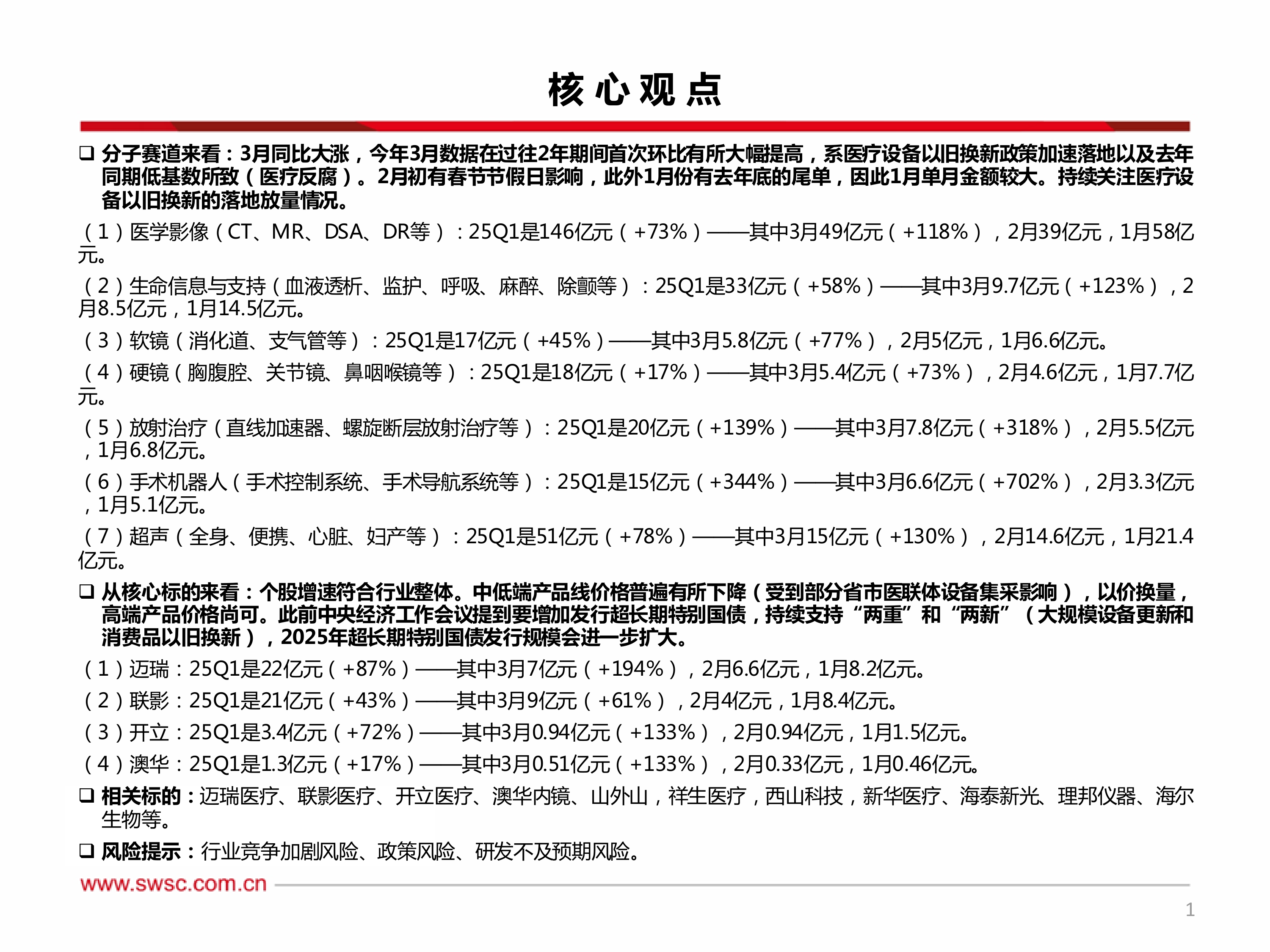 (1)医学影像(CT、MR、DSA、DR等):25Q1是146亿元(+73%)——其中3月49亿元(+118%),2月39亿元,1月58亿元。