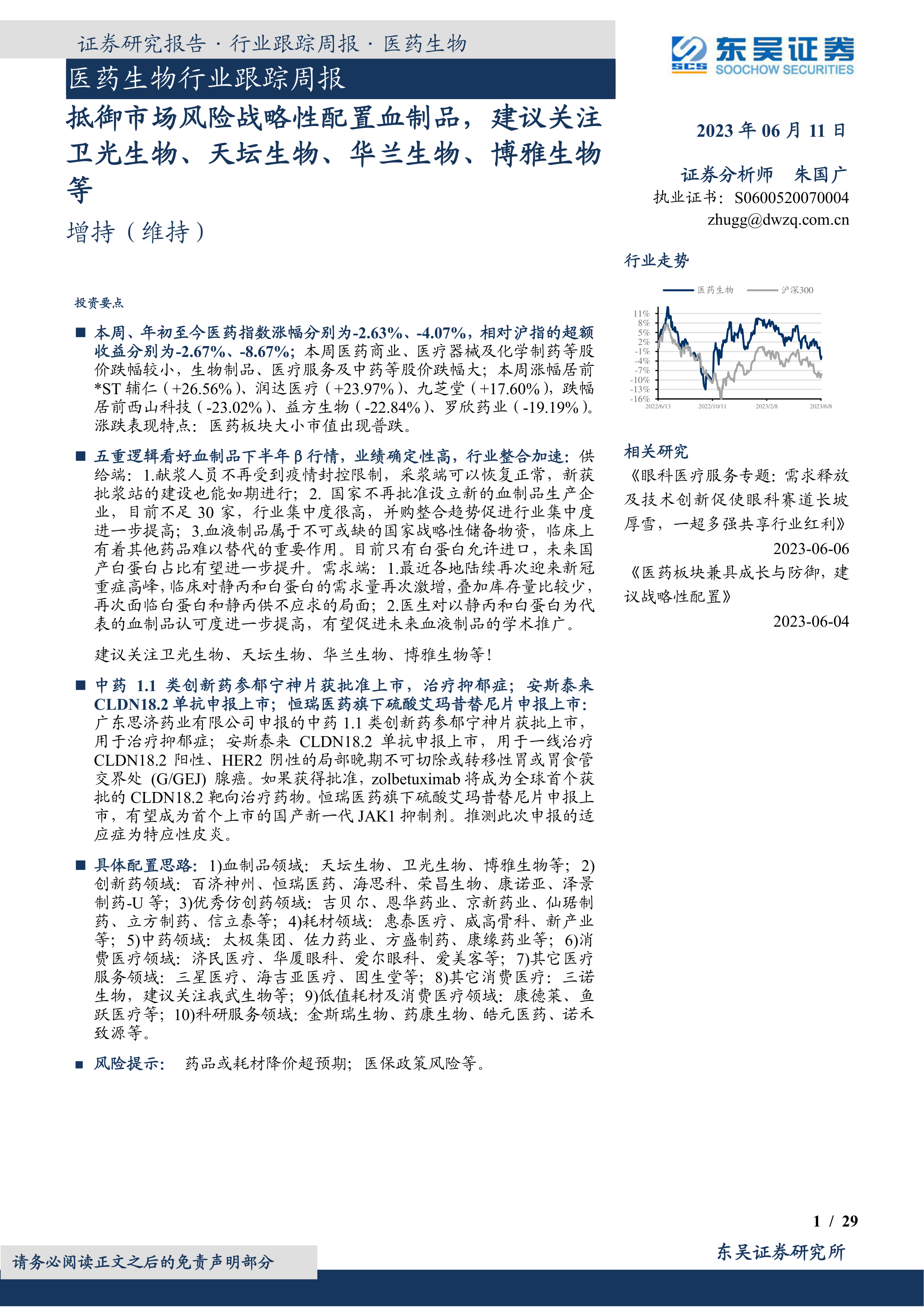 医药生物行业跟踪周报:抵御市场风险战略性配置血制品,建议关注卫光生物、天坛生物、华兰生物、博雅生物等