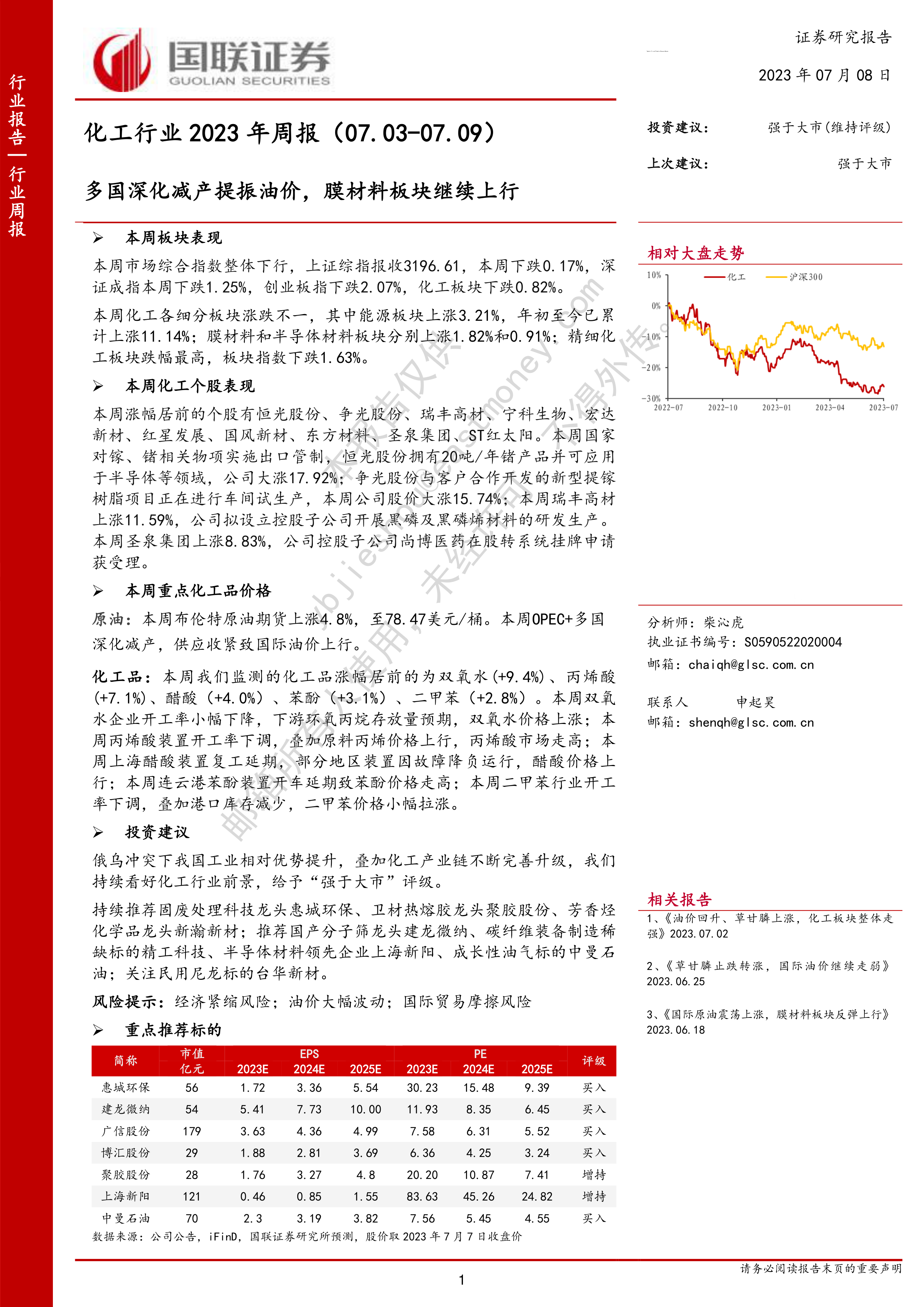 化工行业2023年周报:多国深化减产提振油价,膜材料板块继续上行