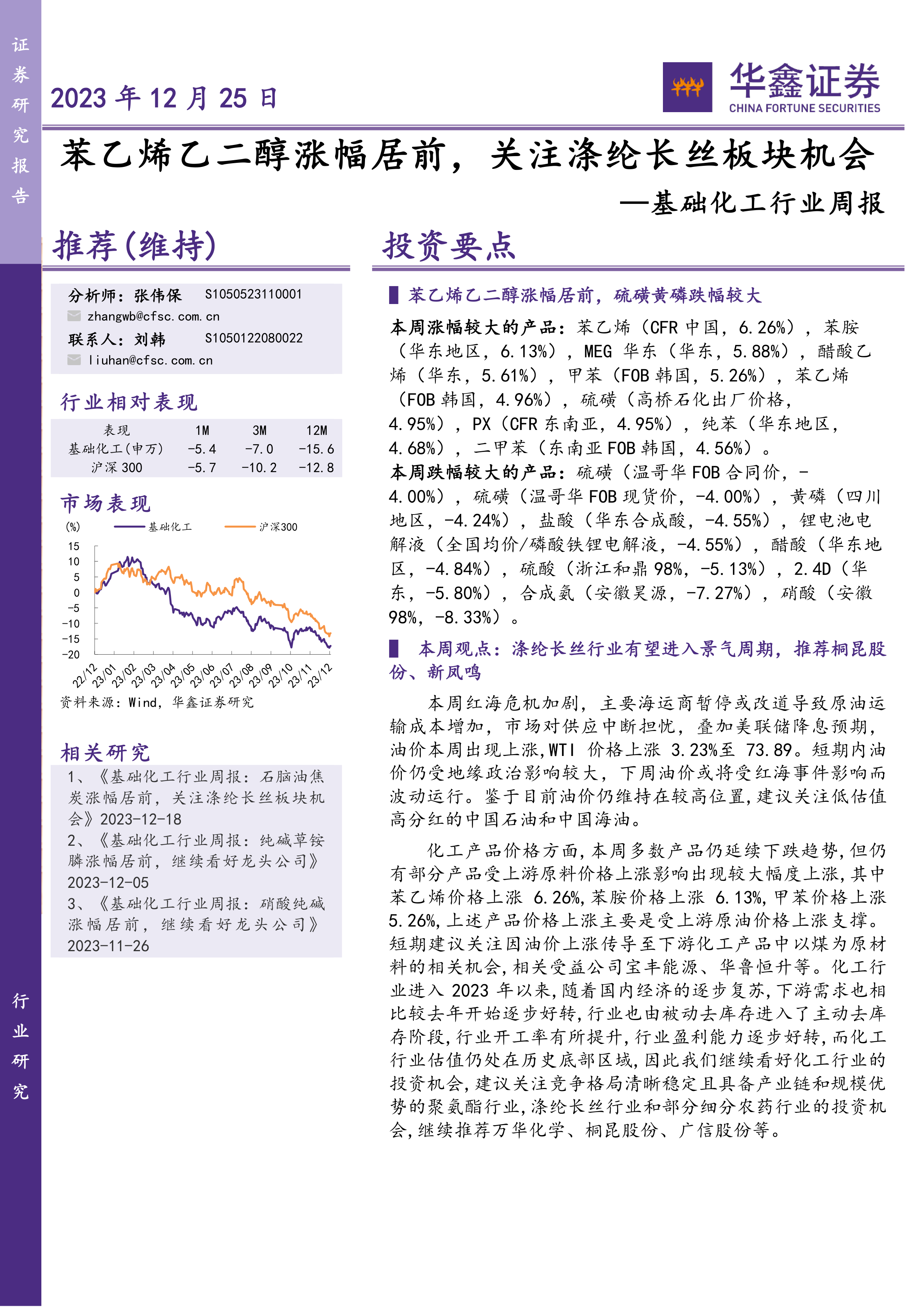 基础化工行业周报:苯乙烯乙二醇涨幅居前,关注涤纶长丝板块机会