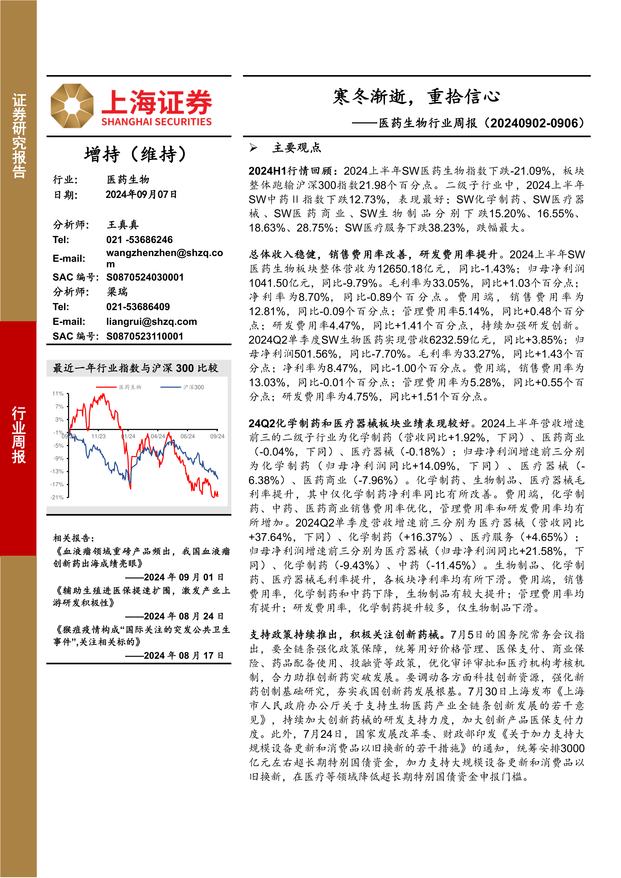 本报告的核心观点是:2024年上半年,SW医药生物指数表现疲软,但部分细分领域展现出韧性,且政策支持力度加大,预示着医药板块基本面逐渐筑底企稳。