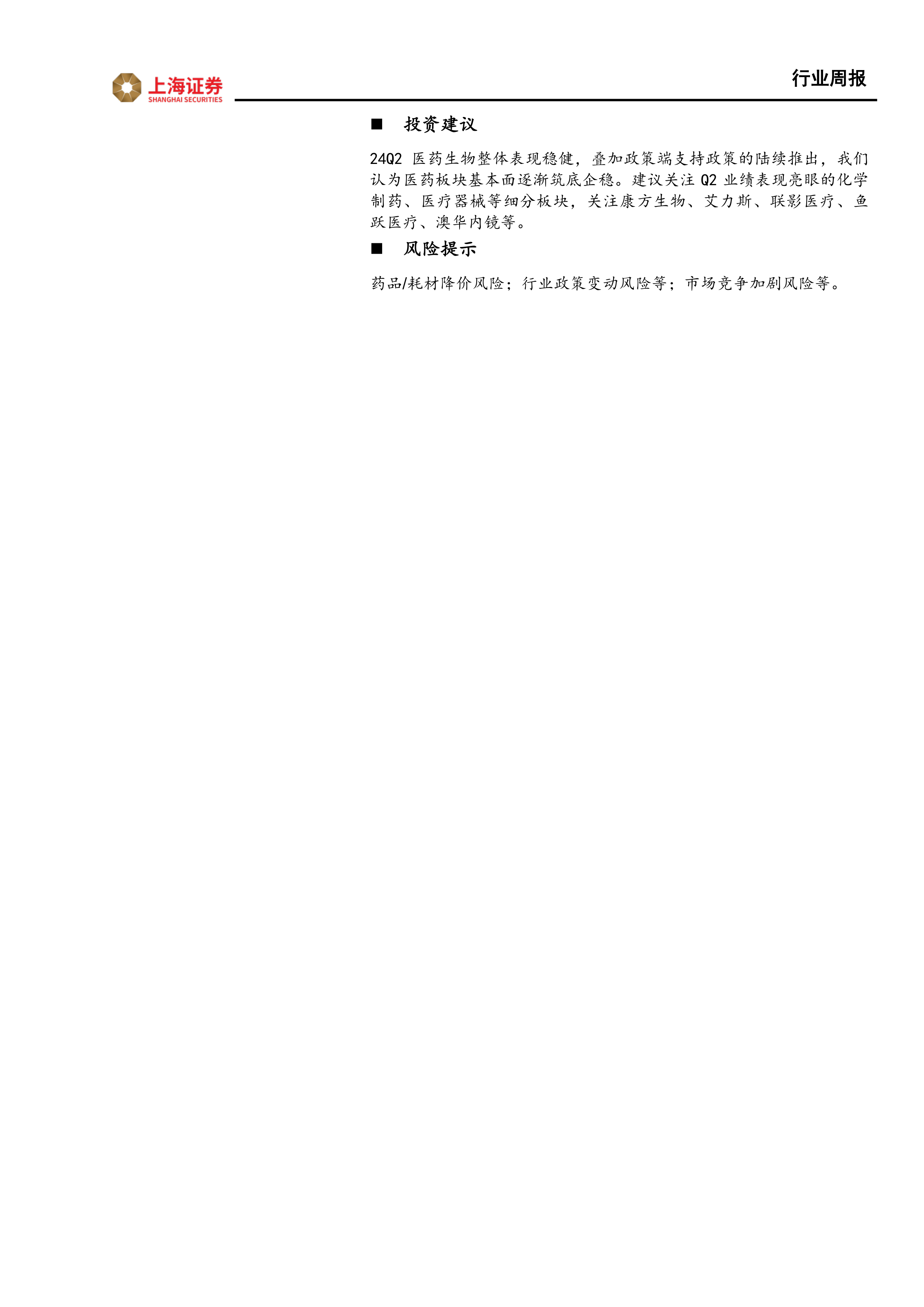 24Q2医药生物整体表现稳健,叠加政策端支持政策的陆续推出,我们认为医药板块基本面逐渐筑底企稳。建议关注Q2业绩表现亮眼的化学制药、医疗器械等细分板块,关注康方生物、艾力斯、联影医疗、鱼跃医疗、澳华内镜等。