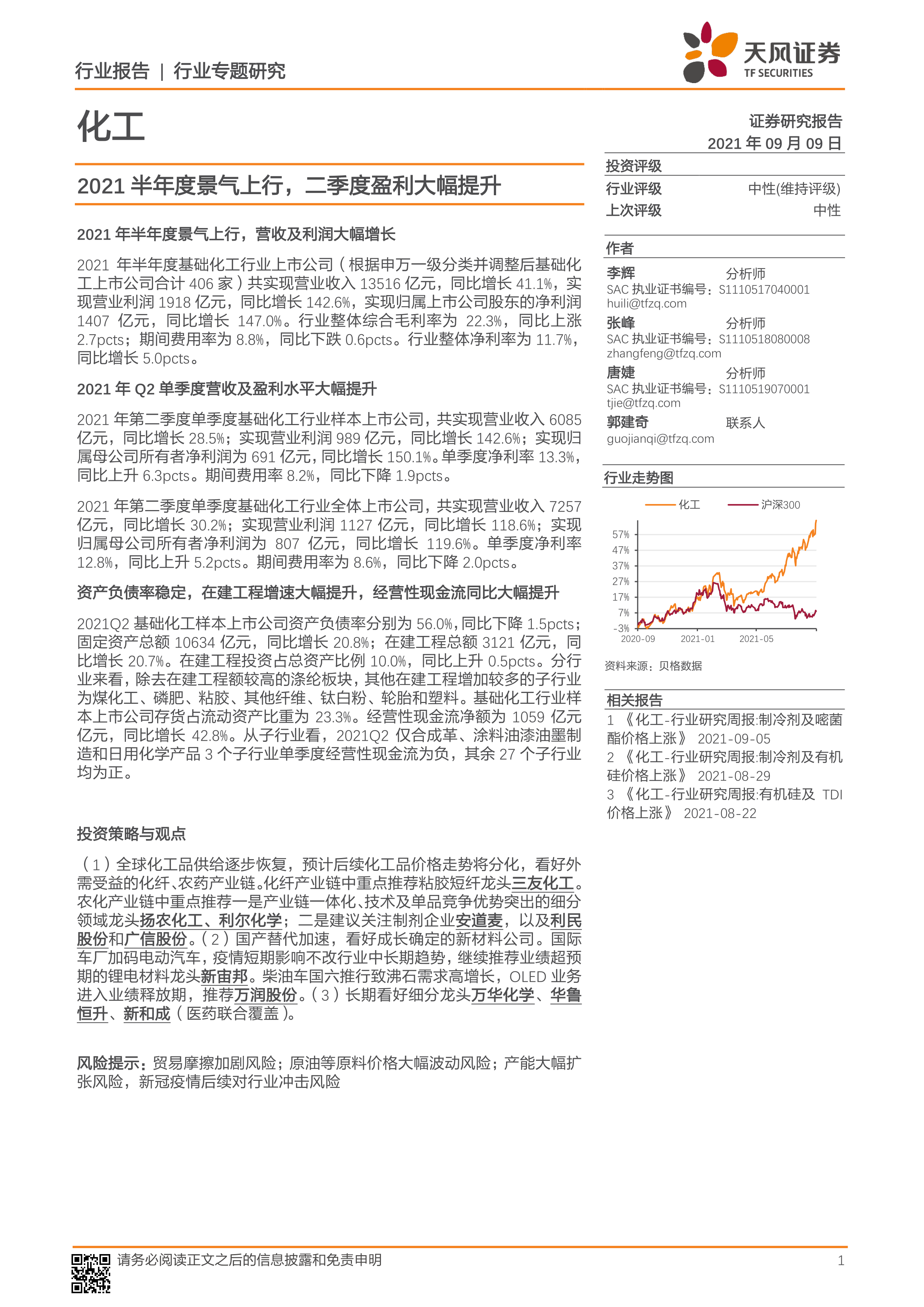 化工行业专题研究:2021半年度景气上行,二季度盈利大幅提升