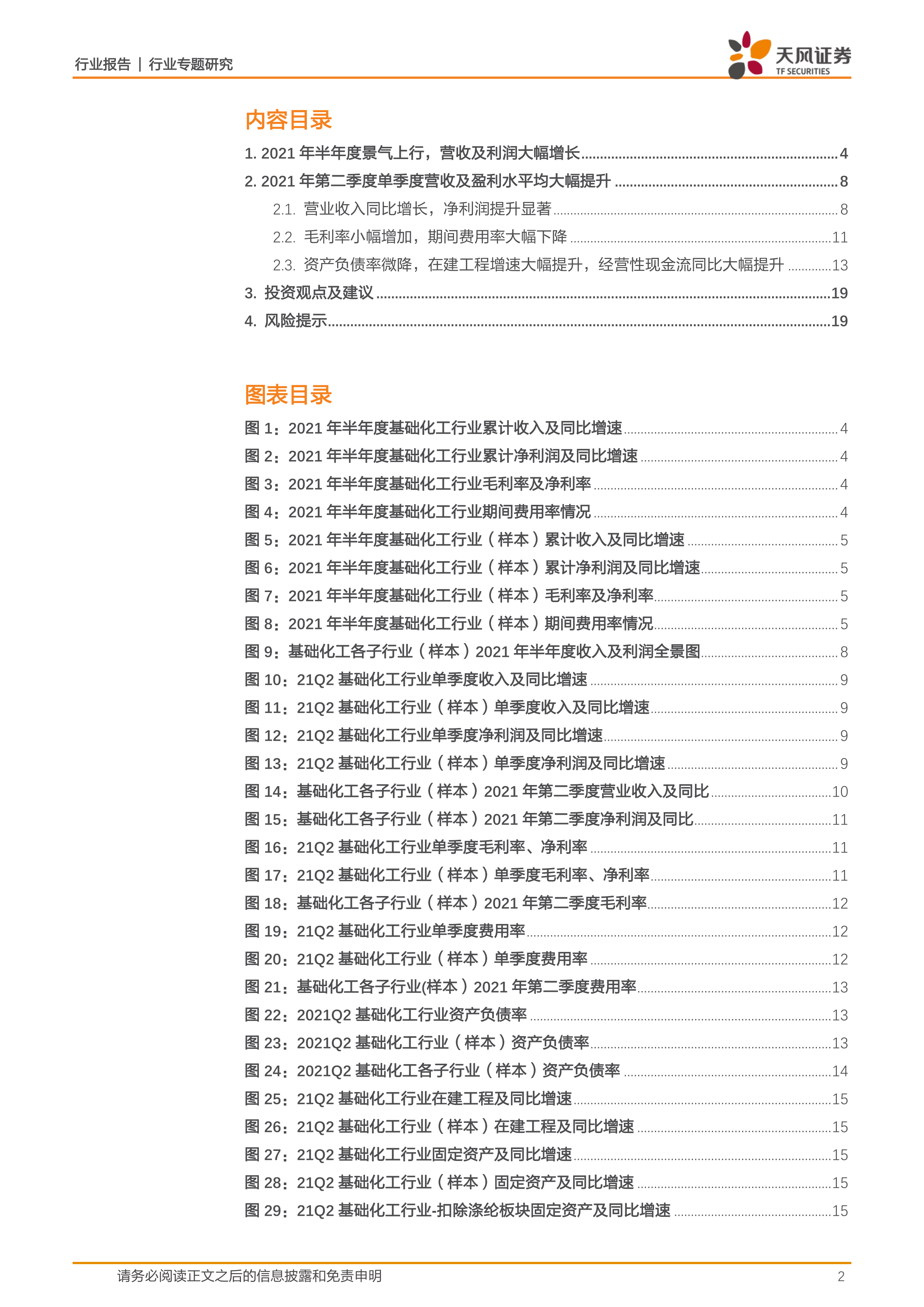 本报告的核心观点是:2021年上半年,基础化工行业景气度上行,营收和利润大幅增长。尤其在第二季度,增长更为显著。但未来行业发展面临诸多风险,例如贸易摩擦加剧、原材料价格波动、产能扩张以及疫情冲击等。报告建议关注外需受益的化纤、农药产业链,以及国产替代加速背景下的新材料公司和细分龙头企业。