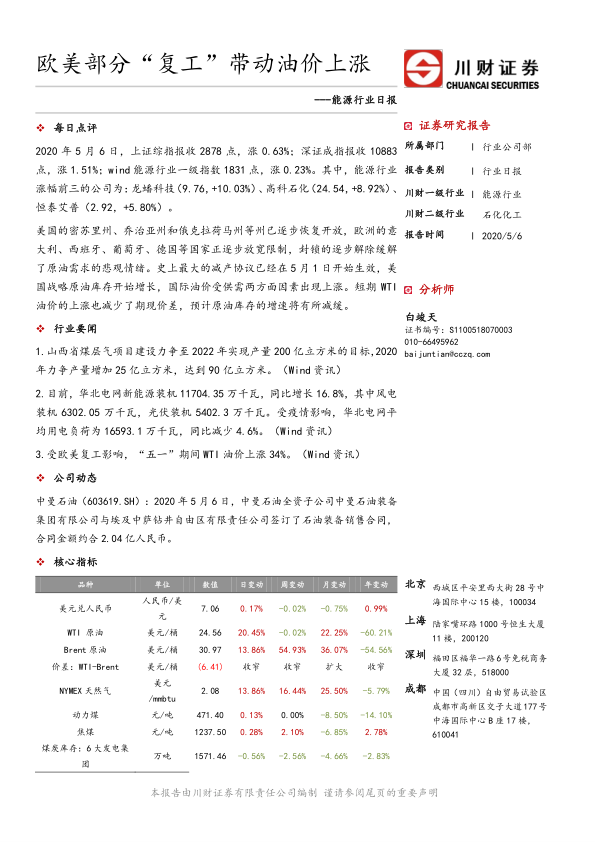 报告首先概述了2020年5月6日中国股市的表现:上证综指上涨0.63%,深证成指上涨1.51%,Wind能源行业一级指数上涨0.23%。能源行业涨幅前三的公司分别为龙蟠科技、高科石化和恒泰艾普。