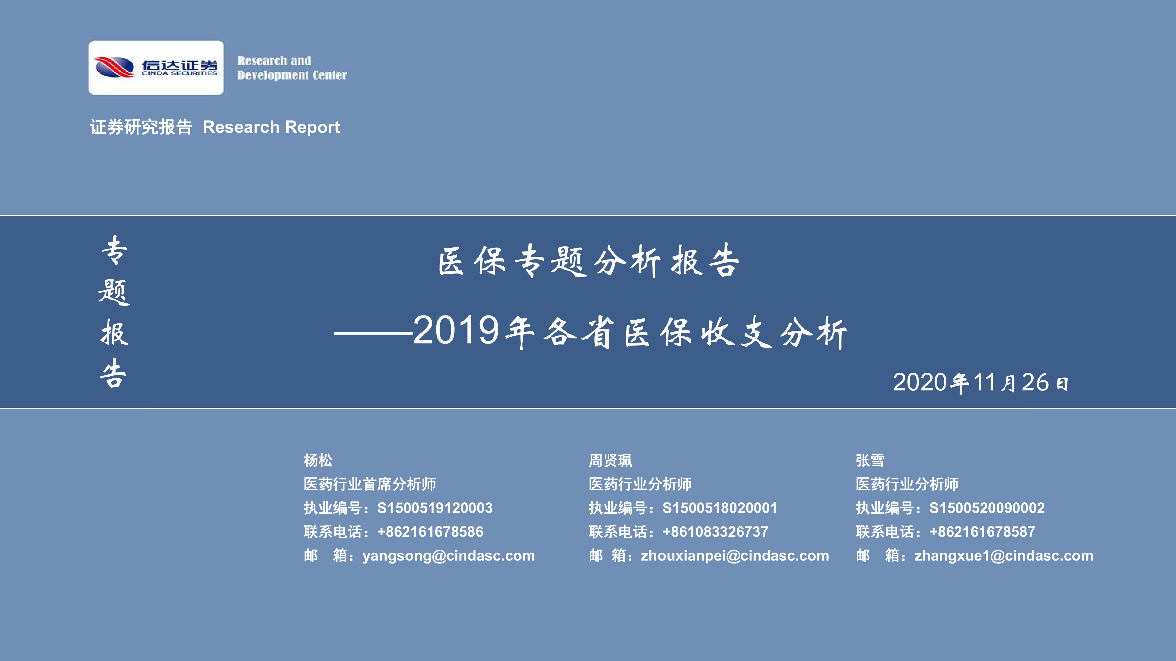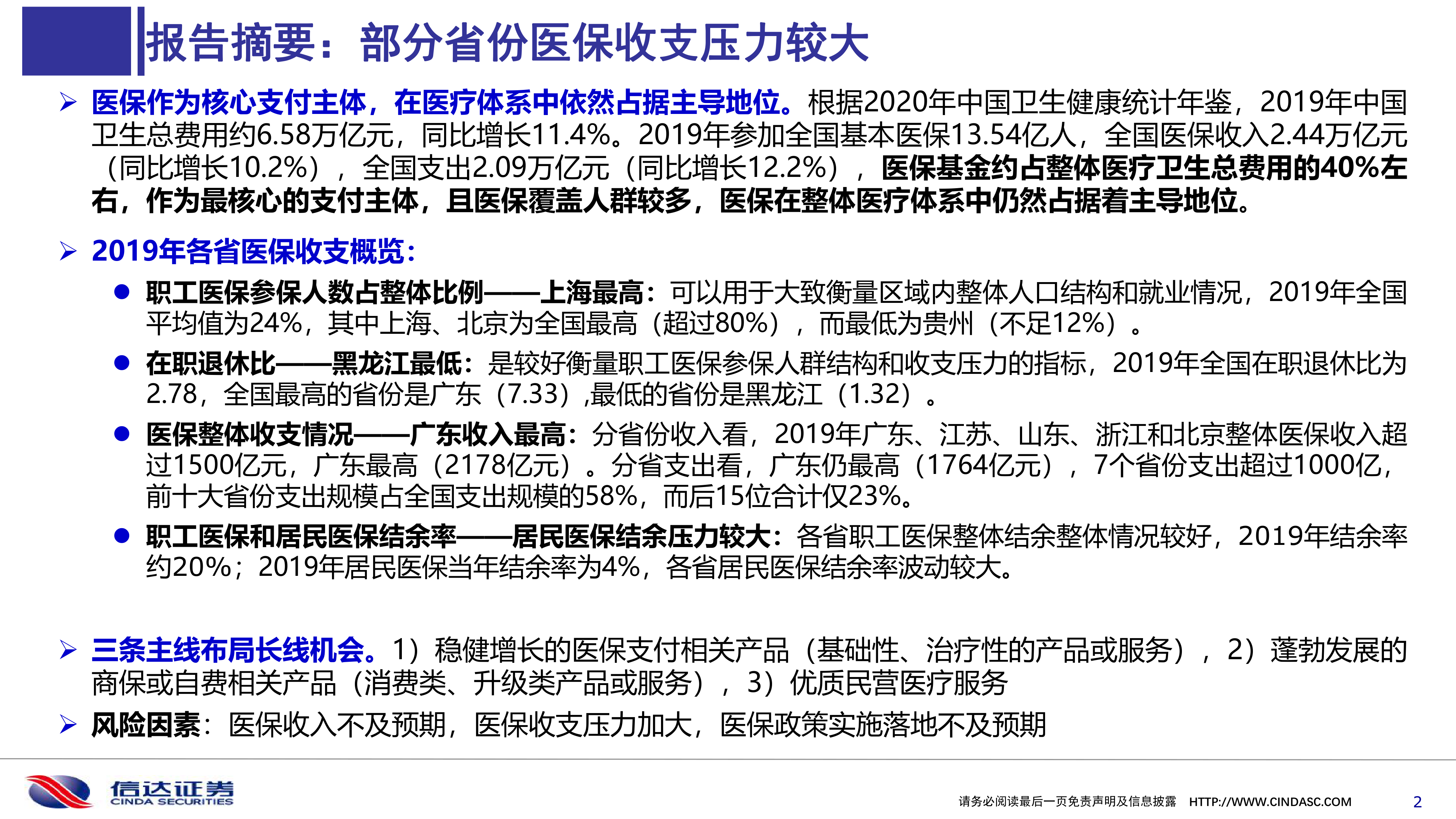 本报告基于2019年中国各省医保收支数据,对中国医保市场进行统计分析,揭示了部分省份医保收支压力较大的现状,并据此提出投资建议。核心观点如下: