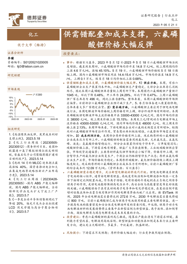 本报告的核心观点是:由于供需错配和成本支撑,六氟磷酸锂价格大幅反弹,市场表现优于大市。 具体而言,报告分析了六氟磷酸锂价格上涨的原因,包括供应紧张、下游需求增加以及原材料价格上涨等因素,并对未来市场走势进行了展望,建议关注相关上市公司。