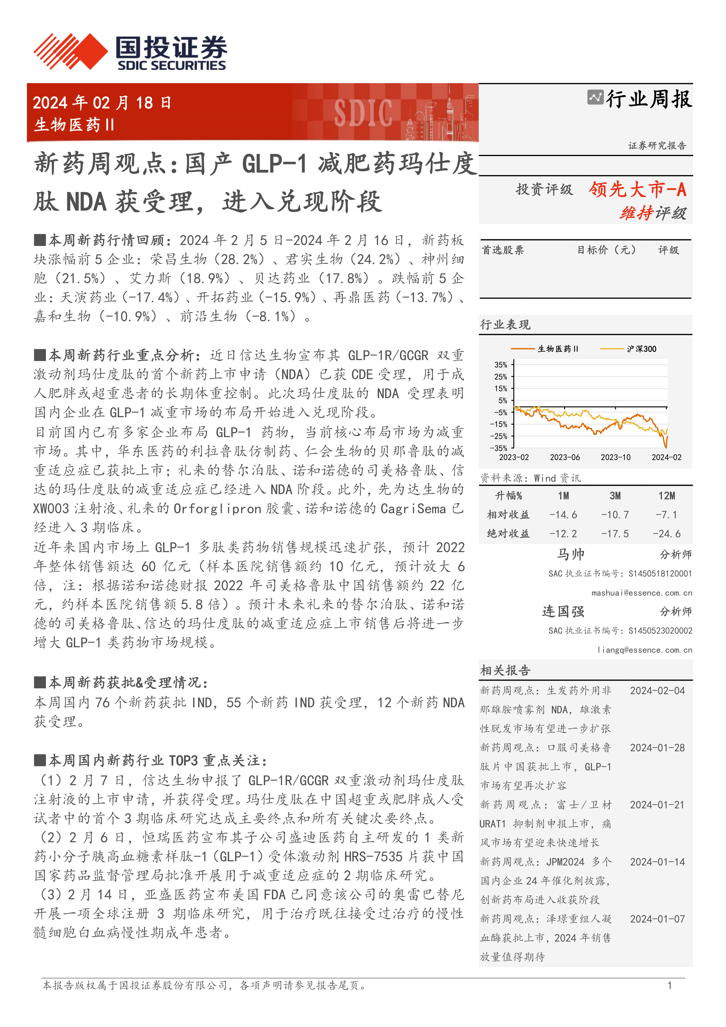 本报告对2024年2月18日生物医药Ⅱ行业进行了周度总结,重点关注了信达生物玛仕度肽NDA获受理事件及其对国内GLP-1减重药物市场的影响。报告分析了国内外新药市场行情、重点药物研发进展、获批及受理情况,并对国内外重点企业和药物进行了深入分析。 报告指出,国内GLP-1减重药物市场规模快速增长,未来发展潜力巨大,但也存在一定的风险。 投资者需谨慎评估风险,做出理性投资决策。