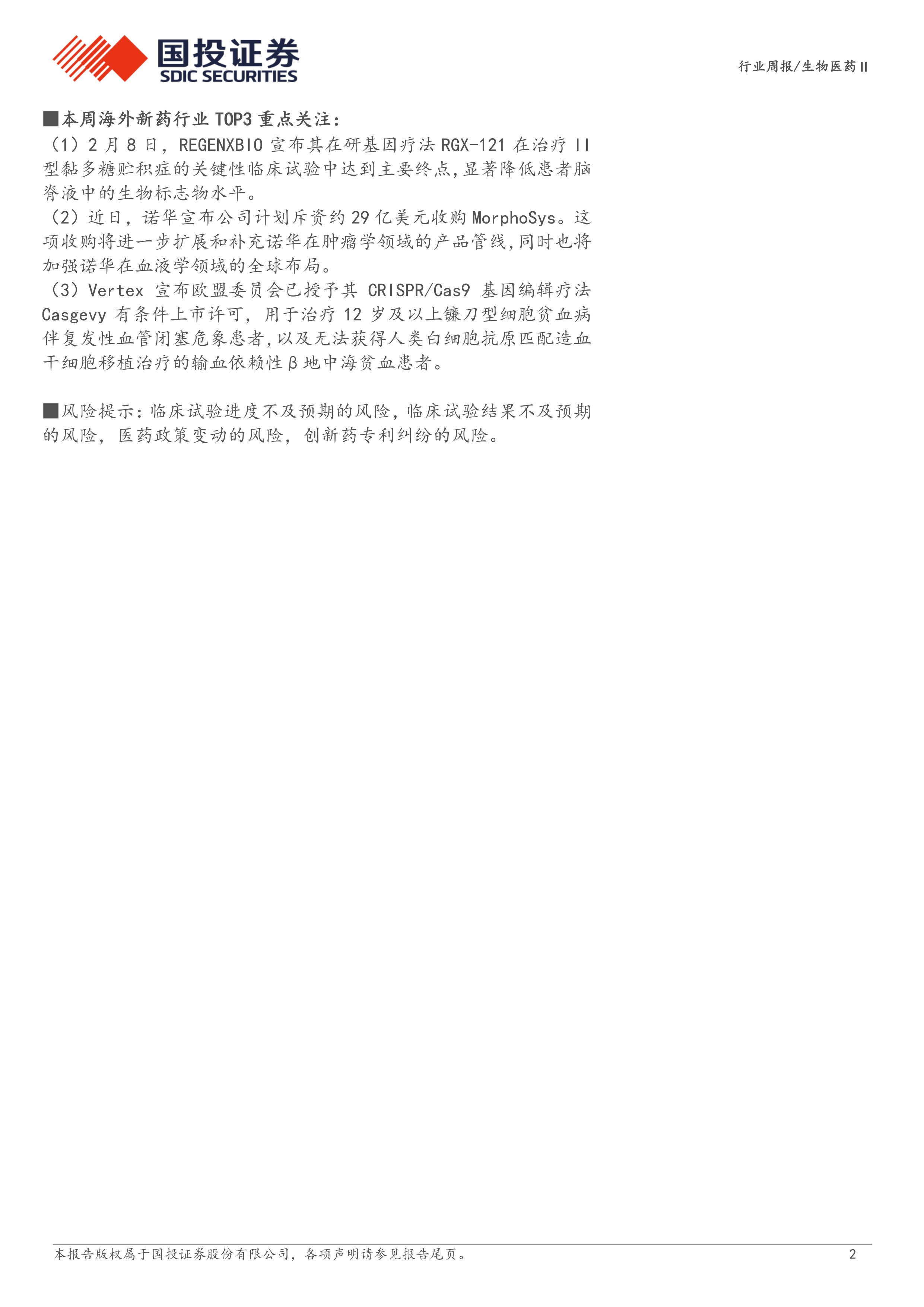 本周海外新药行业重点关注REGENXBIO RGX-121基因疗法达到关键性临床试验主要终点、诺华计划收购MorphoSys、Vertex CRISPR基因编辑疗法Casgevy获欧盟有条件上市许可等事件。 报告同样列出了其他重点关注事件,并对这些事件进行了简要分析,涵盖了多个国际知名药企的研发进展和商业活动。