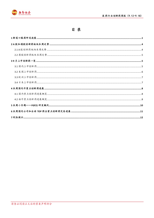 本报告对2022年9月第三周的创新药市场进行了全面的分析,涵盖了市场表现、新冠口服药研发进展、新药上市情况、重点创新药进展、FGF21激动剂研发概况以及重点交易等多个方面。数据显示,创新药市场波动较大,但整体发展势头良好,多个创新药取得突破性进展,未来市场前景值得期待。 然而,投资者仍需关注药品降价风险、医改政策风险以及研发失败风险等潜在风险。