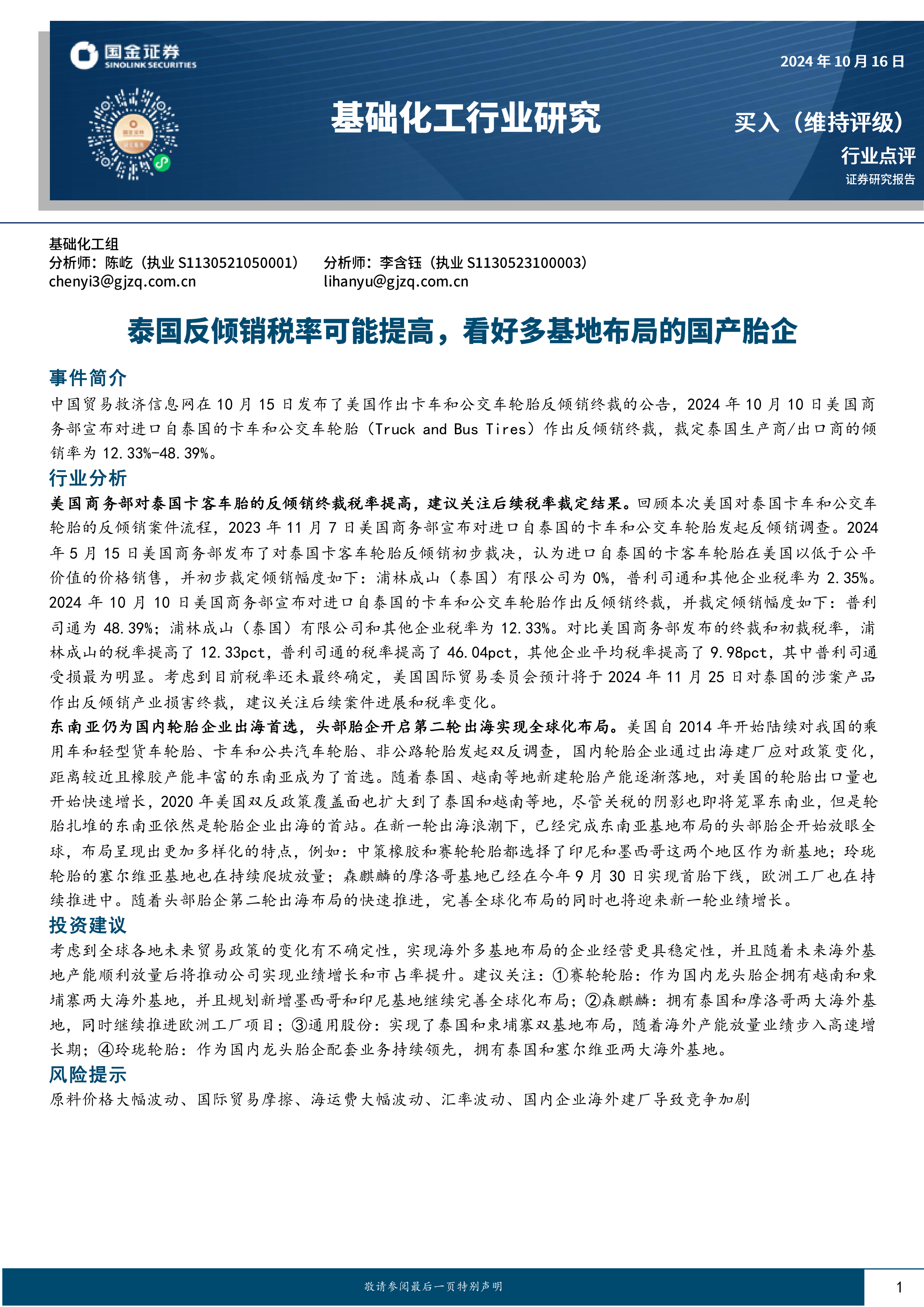 基础化工行业研究:泰国反倾销税率可能提高,看好多基地布局的国产胎企
