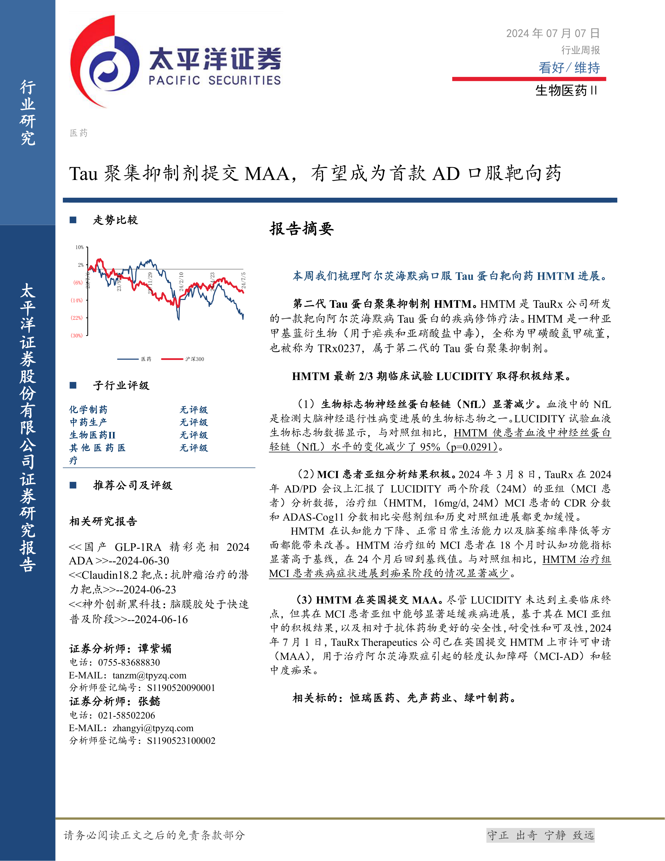 本报告的核心观点是:TauRx公司研发的第二代Tau蛋白聚集抑制剂HMTM,尽管其主要临床终点未达标,但在轻度认知障碍(MCI)患者亚组中展现出显著的疾病进展延缓效果。基于此积极结果以及优越的安全性、耐受性和可及性,HMTM已在英国提交上市许可申请(MAA),有望成为首个口服靶向阿尔茨海默病的药物。此外,报告还分析了本周医药板块整体行情,以及北向和南向资金的流向变化。