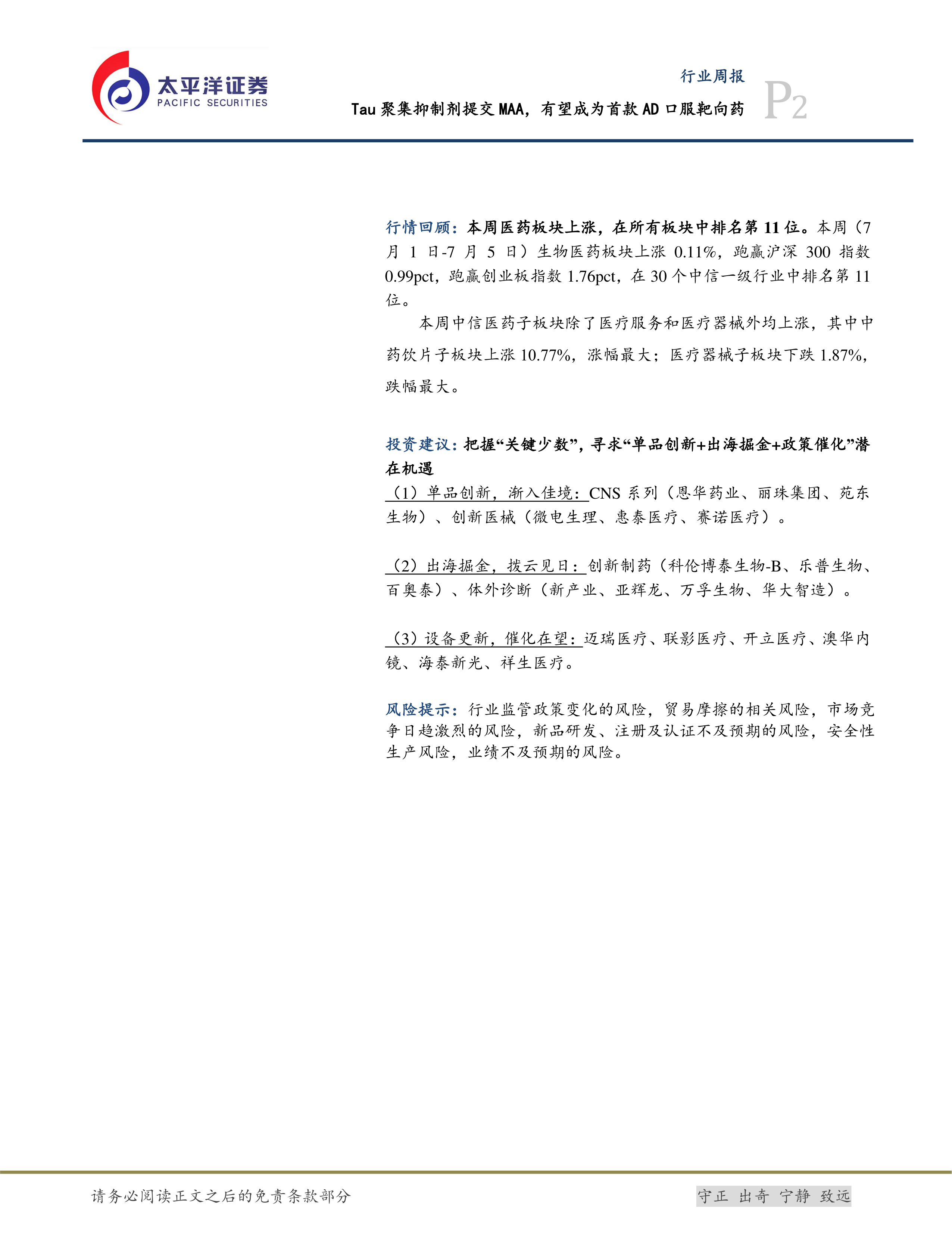 生物医药Ⅱ行业周报:Tau聚集抑制剂提交MAA,有望成为首款AD口服靶向药