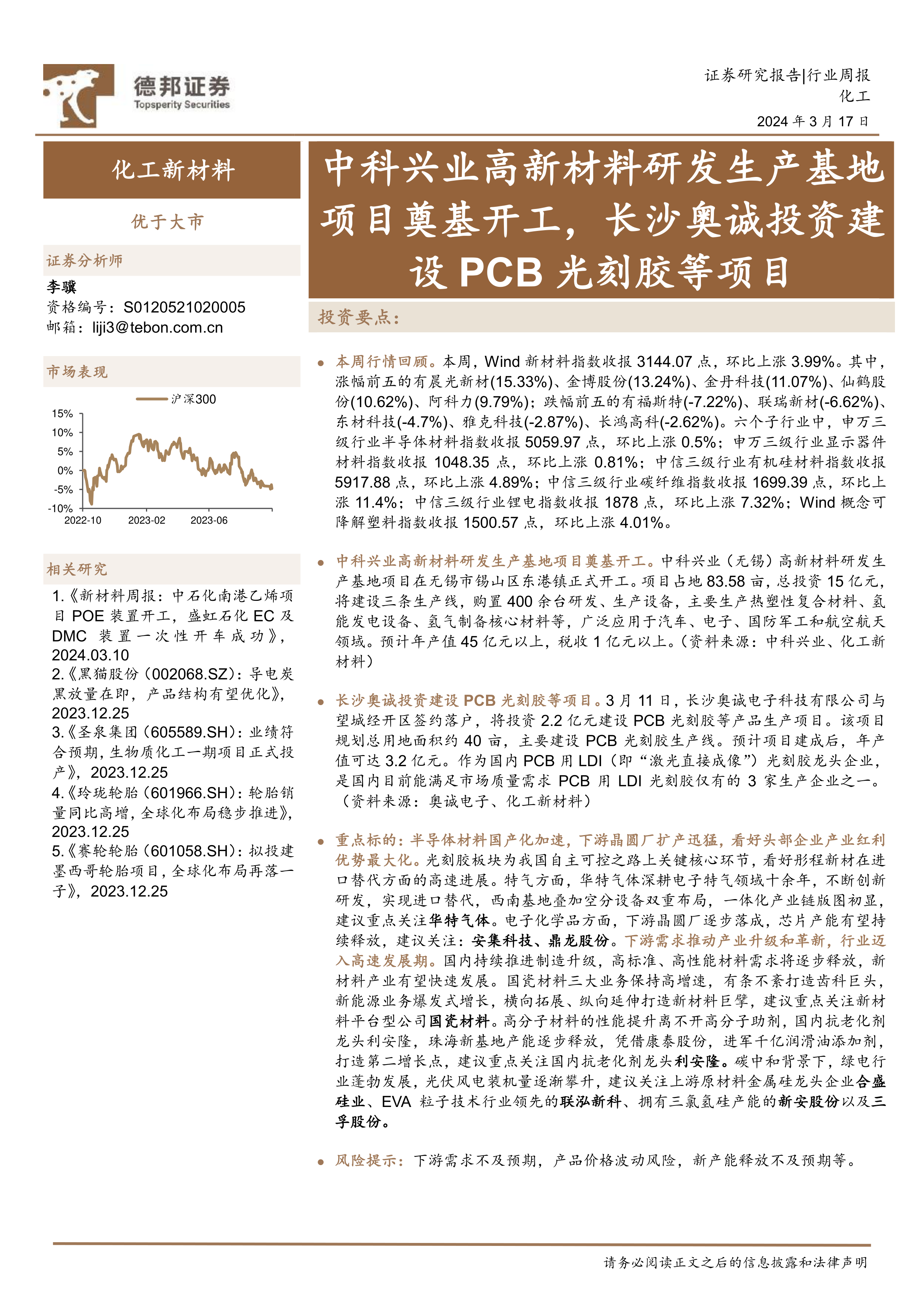 化工新材料行业周报:中科兴业高新材料研发生产基地项目奠基开工,长沙奥诚投资建设PCB光刻胶等项目