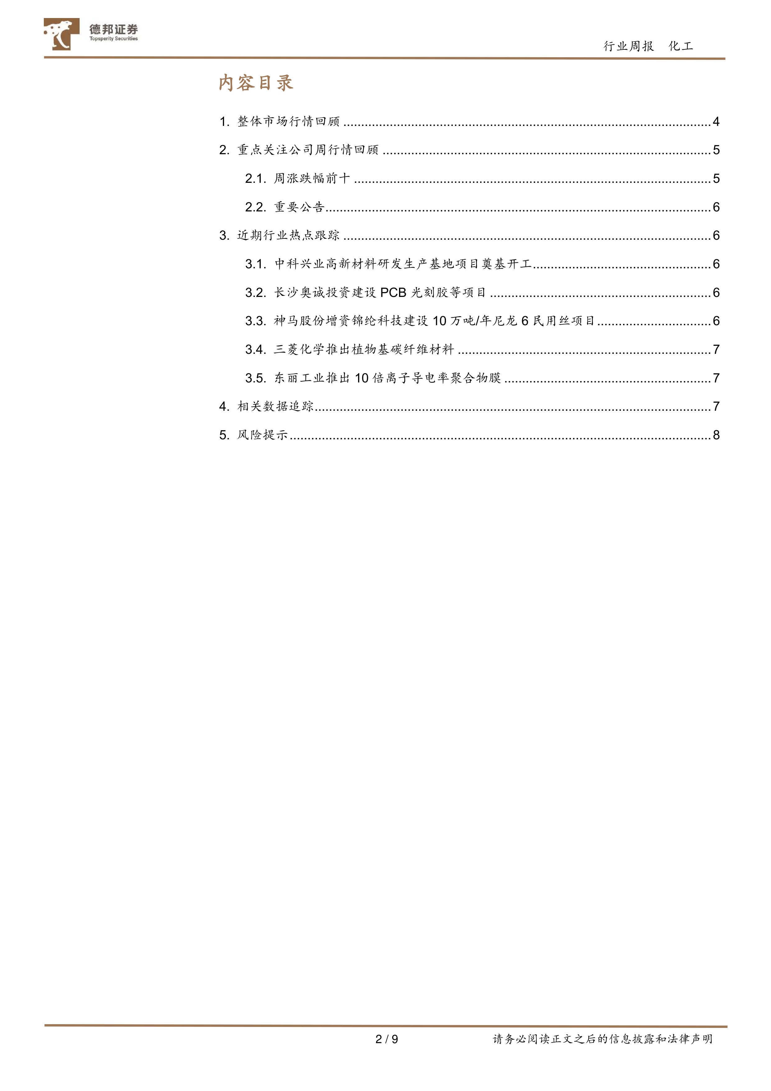 本报告的核心观点是:本周新材料行业整体表现强劲,Wind新材料指数上涨3.99%。多个子行业指数均录得正增长,其中碳纤维指数涨幅最为显著(11.4%)。同时,报告重点关注了中科兴业高新材料研发生产基地项目开工以及长沙奥诚投资建设PCB光刻胶项目的进展,认为这些项目将对相关产业链产生积极影响。此外,报告还分析了部分重点公司的周行情表现,并对未来行业发展趋势进行了展望,提示了潜在的风险因素。
