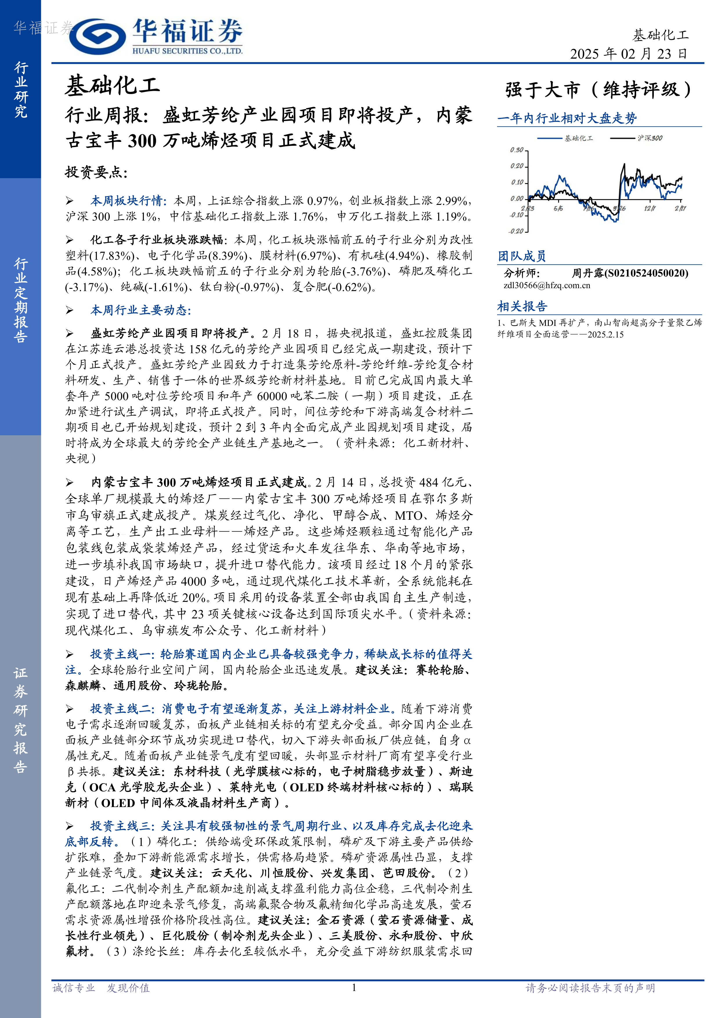 基础化工行业周报:盛虹芳纶产业园项目即将投产,内蒙古宝丰300万吨烯烃项目正式建成