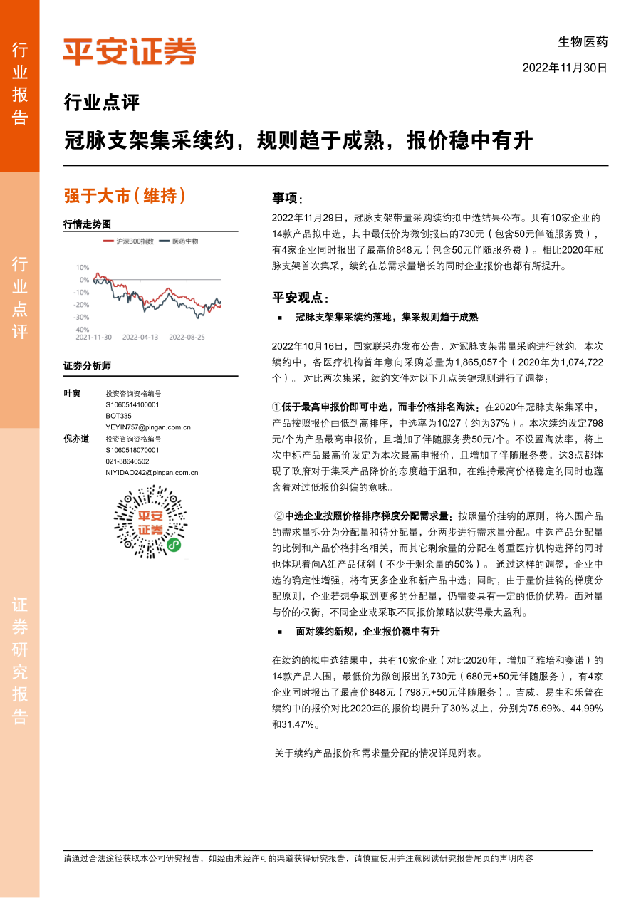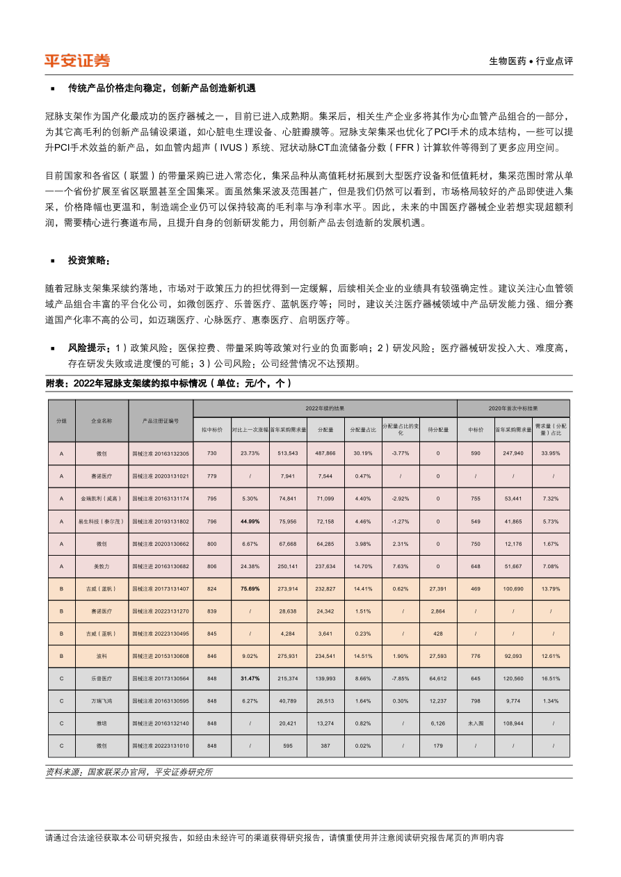 本报告详细分析了2022年11月29日公布的冠脉支架带量采购续约拟中选结果。 报告指出,与2020年首次集采相比,续约在总需求量增长的同时,企业报价也稳步提升。 共有10家企业(较2020年增加雅培和赛诺)的14款产品拟中选,最低价为微创的730元,最高价为4家企业报出的848元。 部分企业(吉威、易生、乐普)报价较2020年提升超过30%。 报告还提供了详细的表格,对比了2022年和2020年冠脉支架集采的中标情况,包括企业名称、产品注册证编号、分配量占比、需求量、拟中标价以及与上一次报价的涨幅等信息。