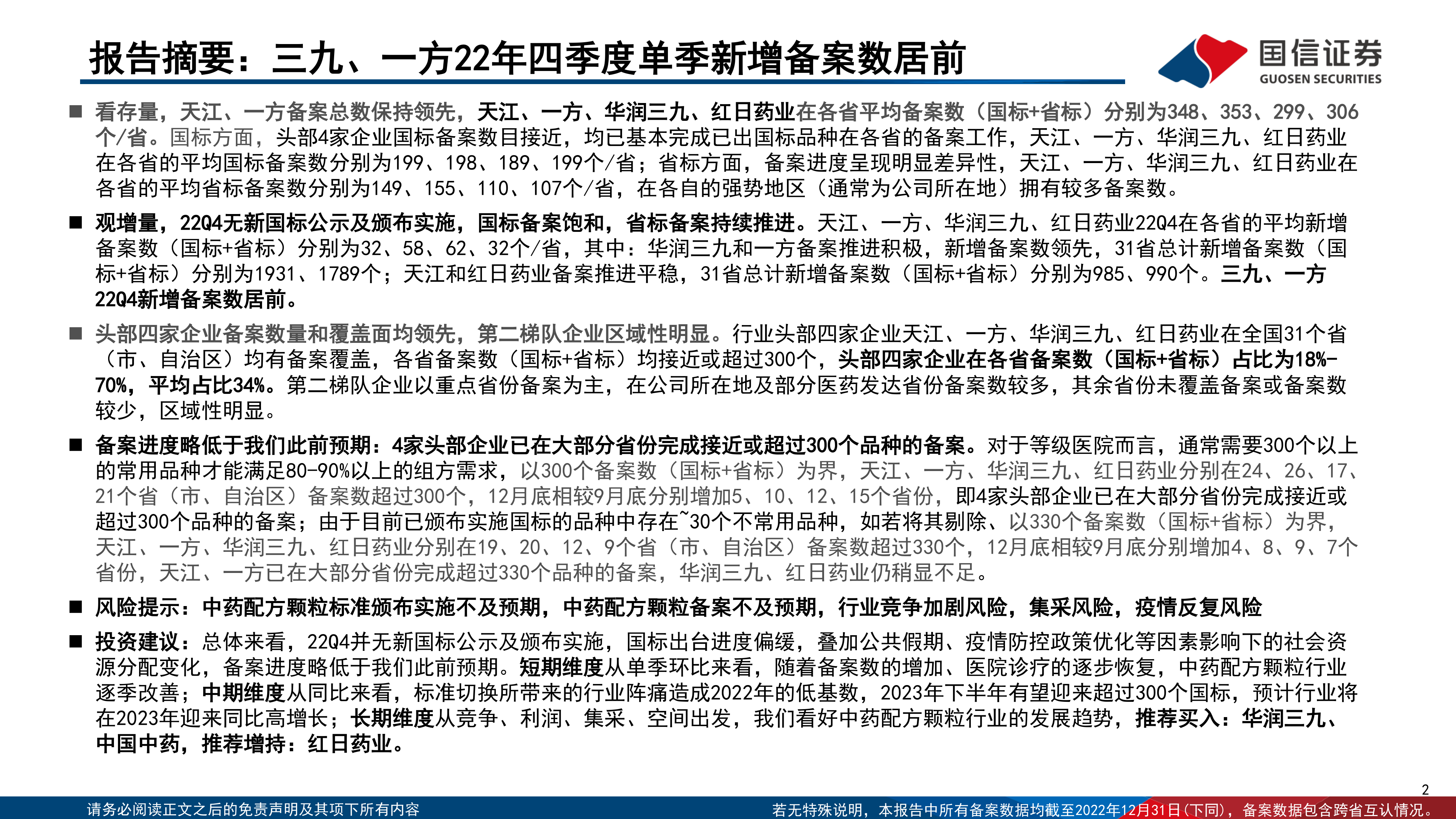本报告的核心观点是:2022年四季度,中药配方颗粒备案工作总体进展略低于预期,国标备案已接近饱和,省标备案持续推进。头部企业(天江、一方、华润三九、红日药业)在备案数量和覆盖面上占据领先地位,但仍需进一步完善省标备案以满足等级医院的需求。 短期内,中药配方颗粒行业将随着备案数增加和医院诊疗恢复而逐季改善;中期来看,2023年下半年有望迎来更多国标品种,行业将实现同比高增长;长期来看,行业发展趋势向好,但需关注行业竞争加剧、集采以及疫情反复等风险。