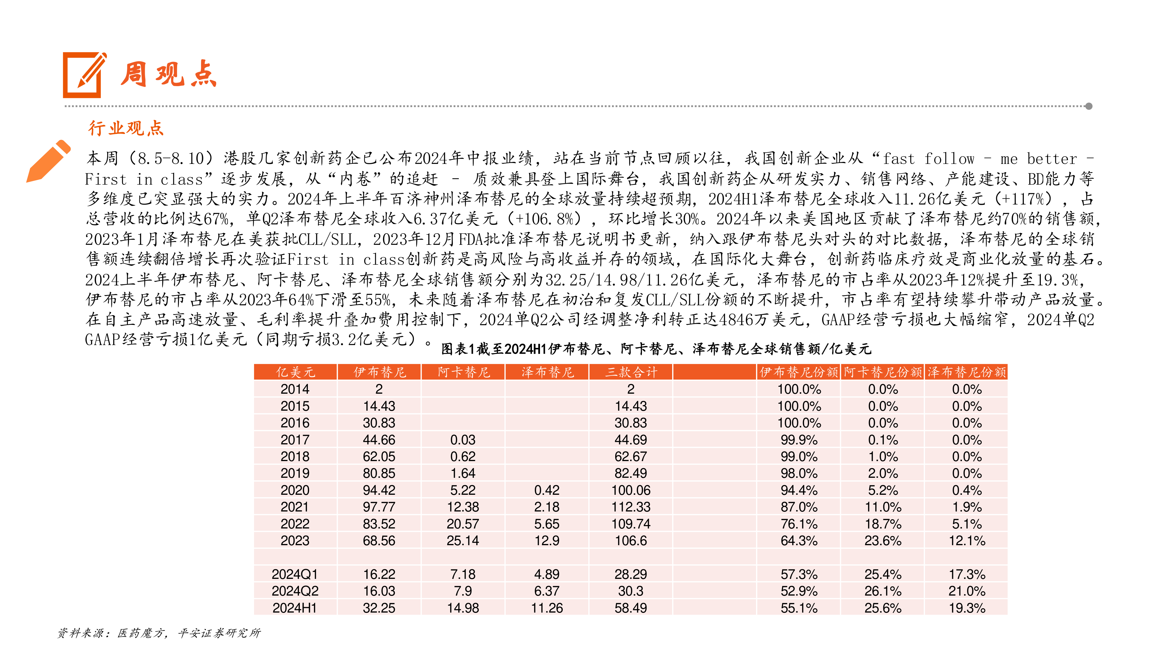 本周(8.5-8.10)港股几家创新药企已公布2024年中报业绩,站在当前节点回顾以往,我国创新企业从“fast follow-me better-First in class”逐步发展,从“内卷”的追赶–质效兼具登上国际舞台,我国创新药企从研发实力、销售网络、产能建设、BD能力等多维度已突显强大的实力。2024年上半年百济神州泽布替尼的全球放量持续超预期,2024H1泽布替尼全球收入11.26亿美元(+117%),占总营收的比例达67%,单Q2泽布替尼全球收入6.37亿美元(+106.8%),环比增长30%。2024年以来美国地区贡献了泽布替尼约70%的销售额,2023年1月泽布替尼在美获批CLL/SLL,2023年12月FDA批准泽布替尼说明书更新,纳入跟伊布替尼头对头的对比数据,泽布替尼的全球销售额连续翻倍增长再次验证First in class创新药是高风险与高收益并存的领域,在国际化大舞台,创新药临床疗效是商业化放量的基石。2024上半年伊布替尼、阿卡替尼、泽布替尼全球销售额分别为32.25/14.98/11.26亿美元,泽布替尼的市占率从2023年12%提升至19.3%,伊布替尼的市占率从2023年64%下滑至55%,未来随着泽布替尼在初治和复发CLL/SLL份额的不断提升,市占率有望持续攀升带动产品放量。在自主产品高速放量、毛利率提升叠加费用控制下,2024单Q2公司经调整净利转正达4846万美元,GAAP经营亏损也大幅缩窄,2024单Q2GAAP经营亏损1亿美元(同期亏损3.2亿美元)。