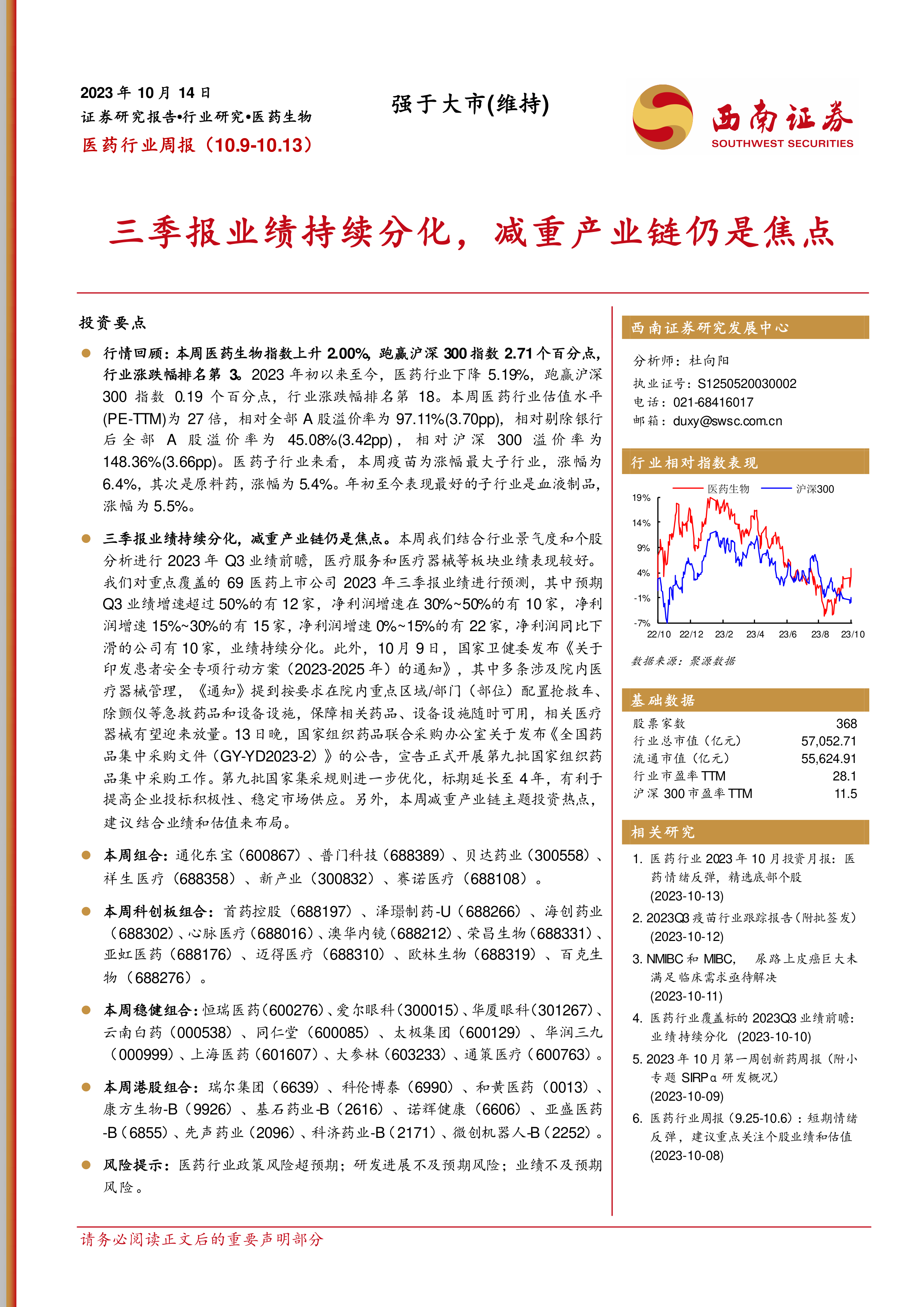 本报告对医药行业本周的市场表现、三季度业绩预测、国家政策以及投资策略进行了全面的分析。数据显示,医药行业本周表现强于大市,但年初至今整体表现落后于大盘。三季度业绩持续分化,医疗服务和医疗器械板块表现较好。国家政策方面,患者安全专项行动方案和第九批国家组织药品集中采购的启动对医疗器械和药品市场产生影响。减重产业链成为本周投资热点,建议投资者结合业绩和估值进行布局。报告还提供了多个组合的投资建议,以及对组合中个股的详细分析,为投资者提供参考。 需要注意的是,报告中提供的预测和投资建议仅供参考,投资者应根据自身情况进行独立判断,并承担相应的投资风险。