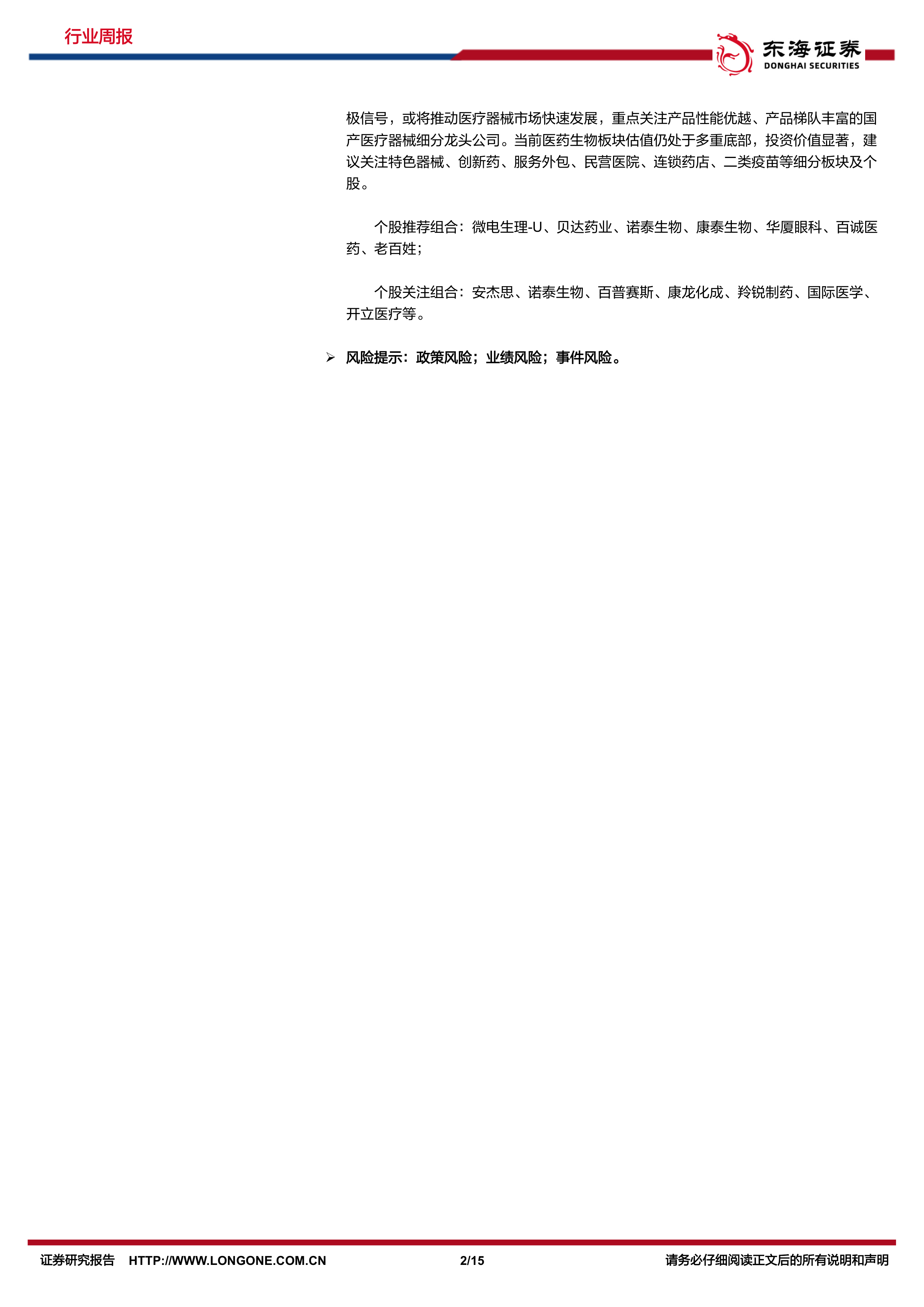 个股关注组合:安杰思、诺泰生物、百普赛斯、康龙化成、羚锐制药、国际医学、开立医疗等。