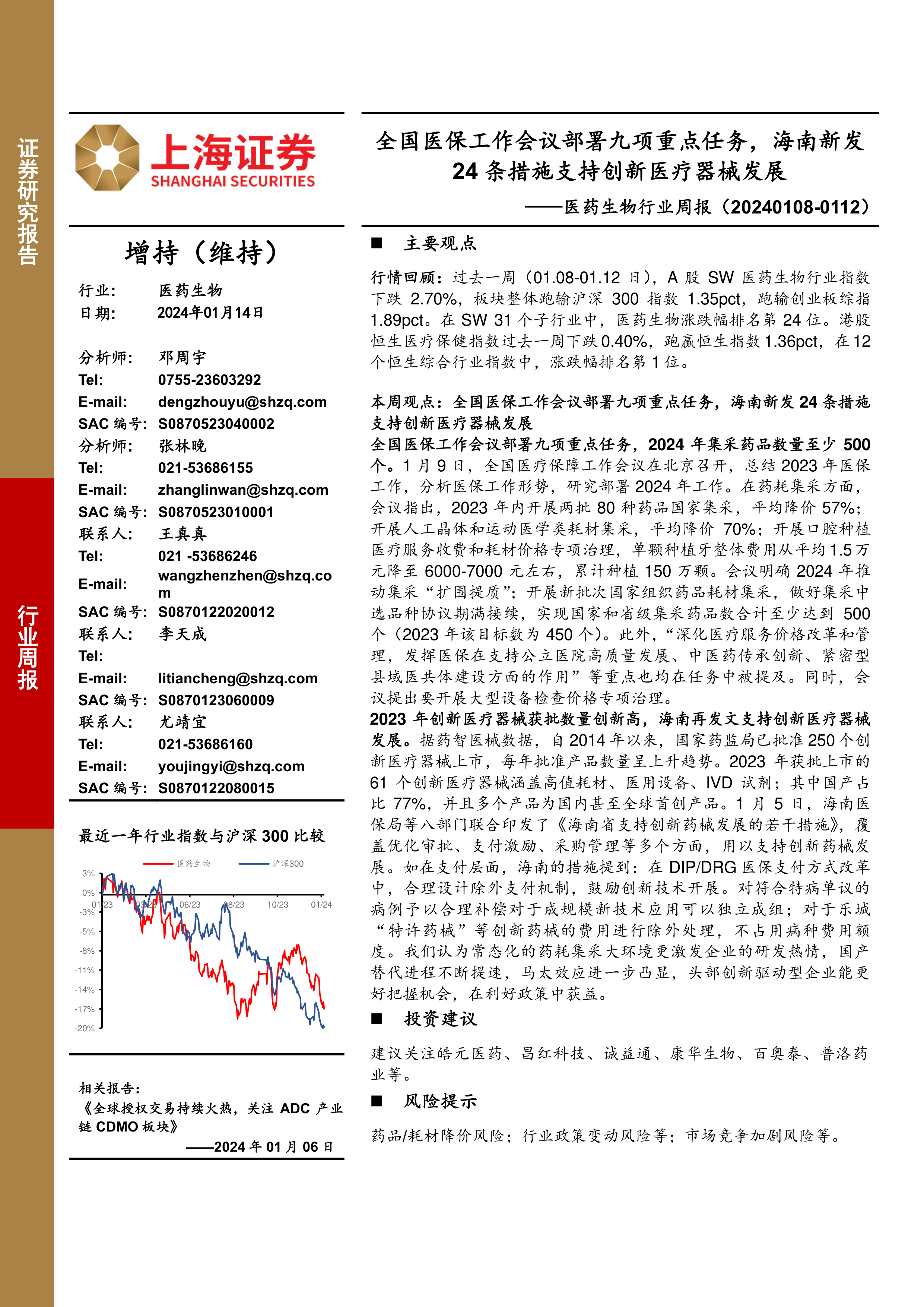 本报告的核心观点是:2024年医药生物行业将面临政策驱动下的深刻变革,国家医保局的九项重点任务,特别是集采“扩围提质”和价格专项治理,将持续影响行业格局;而海南省出台的24条措施则为创新医疗器械发展提供了新的机遇。总体而言,常态化的药耗集采将进一步激发企业研发热情,加速国产替代进程,头部创新驱动型企业将从中受益。