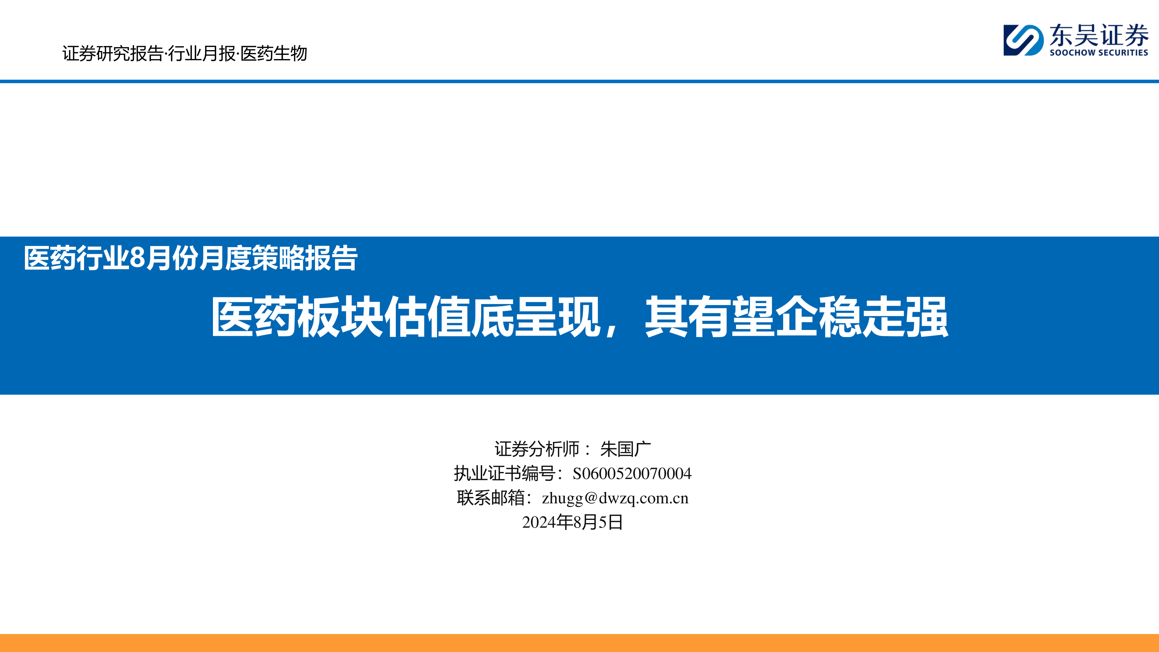 这份东吴证券医药行业8月份月度策略报告的核心观点是:医药板块估值已处于底部,有望企稳走强,9月至10月将是医药股的黄金投资期。报告基于以下四个主要原因: