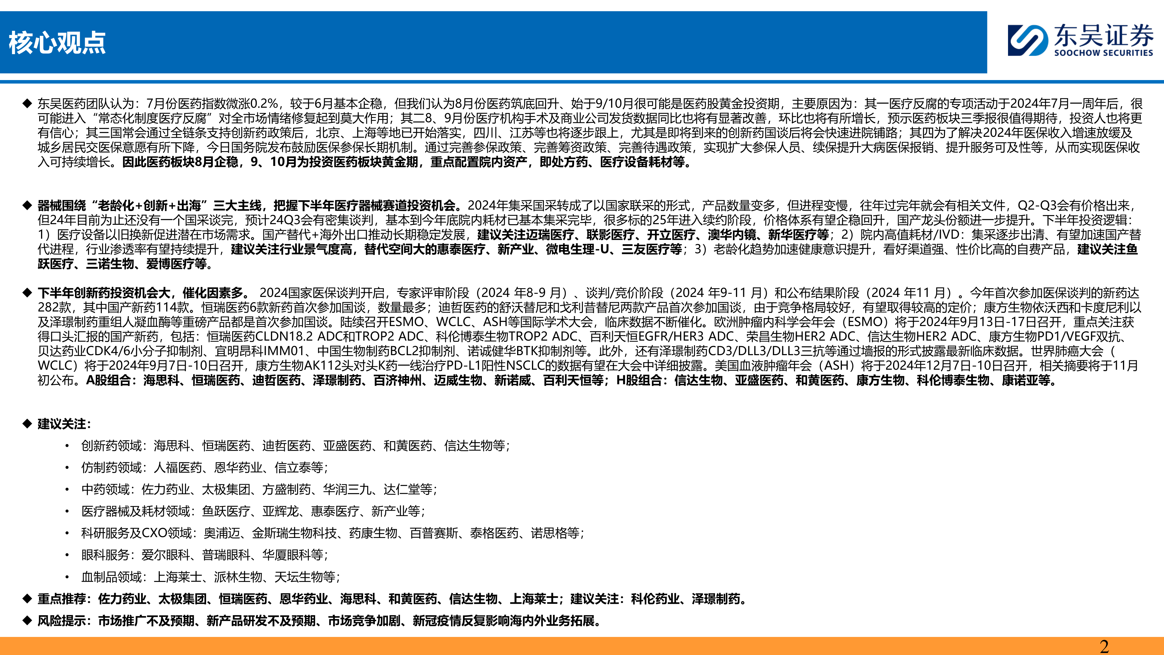 东吴医药团队认为:7月份医药指数微涨0.2%,较于6月基本企稳,但我们认为8月份医药筑底回升、始于9/10月很可能是医药股黄金投资期,主要原因为:其一医疗反腐的专项活动于2024年7月一周年后,很可能进入“常态化制度医疗反腐”对全市场情绪修复起到莫大作用;其二8、9月份医疗机构手术及商业公司发货数据同比也将有显著改善,环比也将有所增长,预示医药板块三季报很值得期待,投资人也将更有信心;其三国常会通过全链条支持创新药政策后,北京、上海等地已开始落实,四川、江苏等也将逐步跟上,尤其是即将到来的创新药国谈后将会快速进院铺路;其四为了解决2024年医保收入增速放缓及城乡居民交医保意愿有所下降,今日国务院发布鼓励医保参保长期机制。通过完善参保政策、完善筹资政策、完善待遇政策,实现扩大参保人员、续保提升大病医保报销、提升服务可及性等,从而实现医保收入可持续增长。因此医药板块8月企稳,9、10月为投资医药板块黄金期,重点配置院内资产,即处方药、医疗设备耗材等。