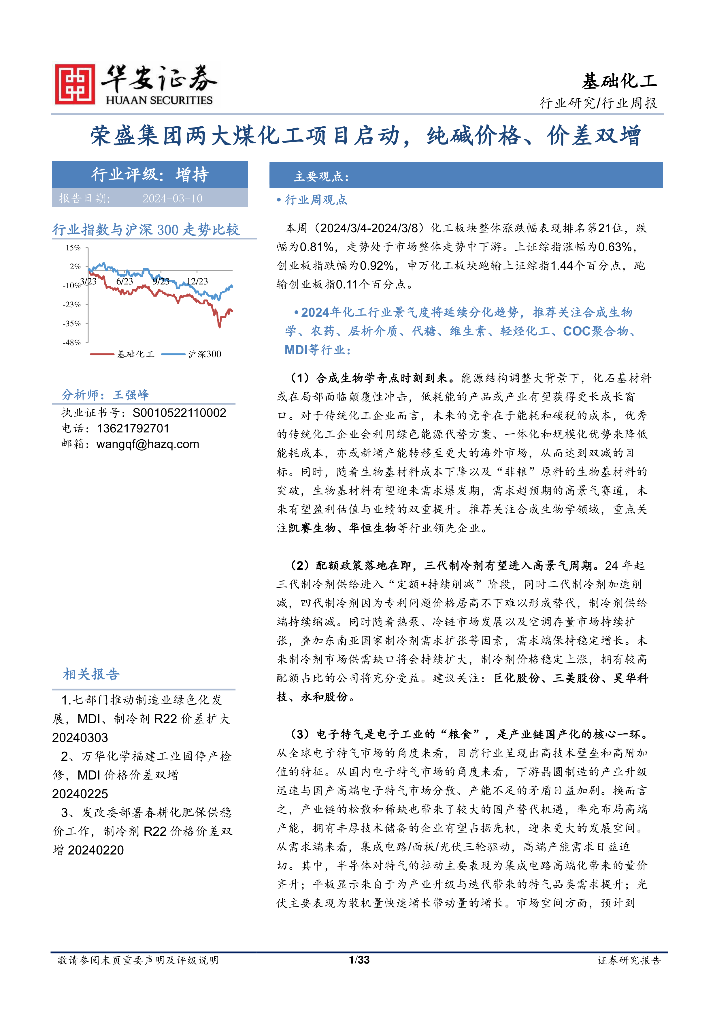 基础化工行业周报:荣盛集团两大煤化工项目启动,纯碱价格、价差双增