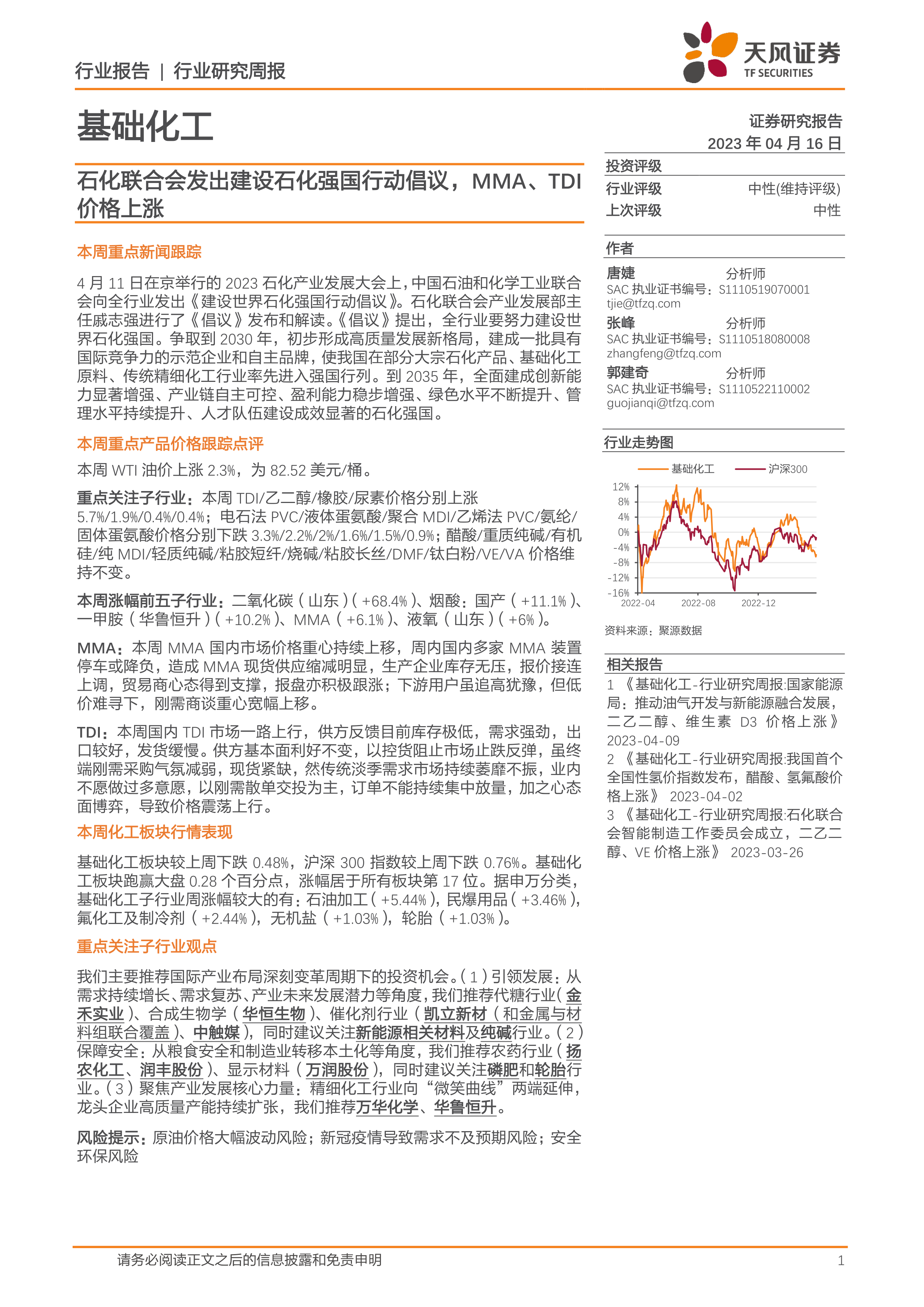 基础化工行业研究周报:石化联合会发出建设石化强国行动倡议,MMA、TDI价格上涨