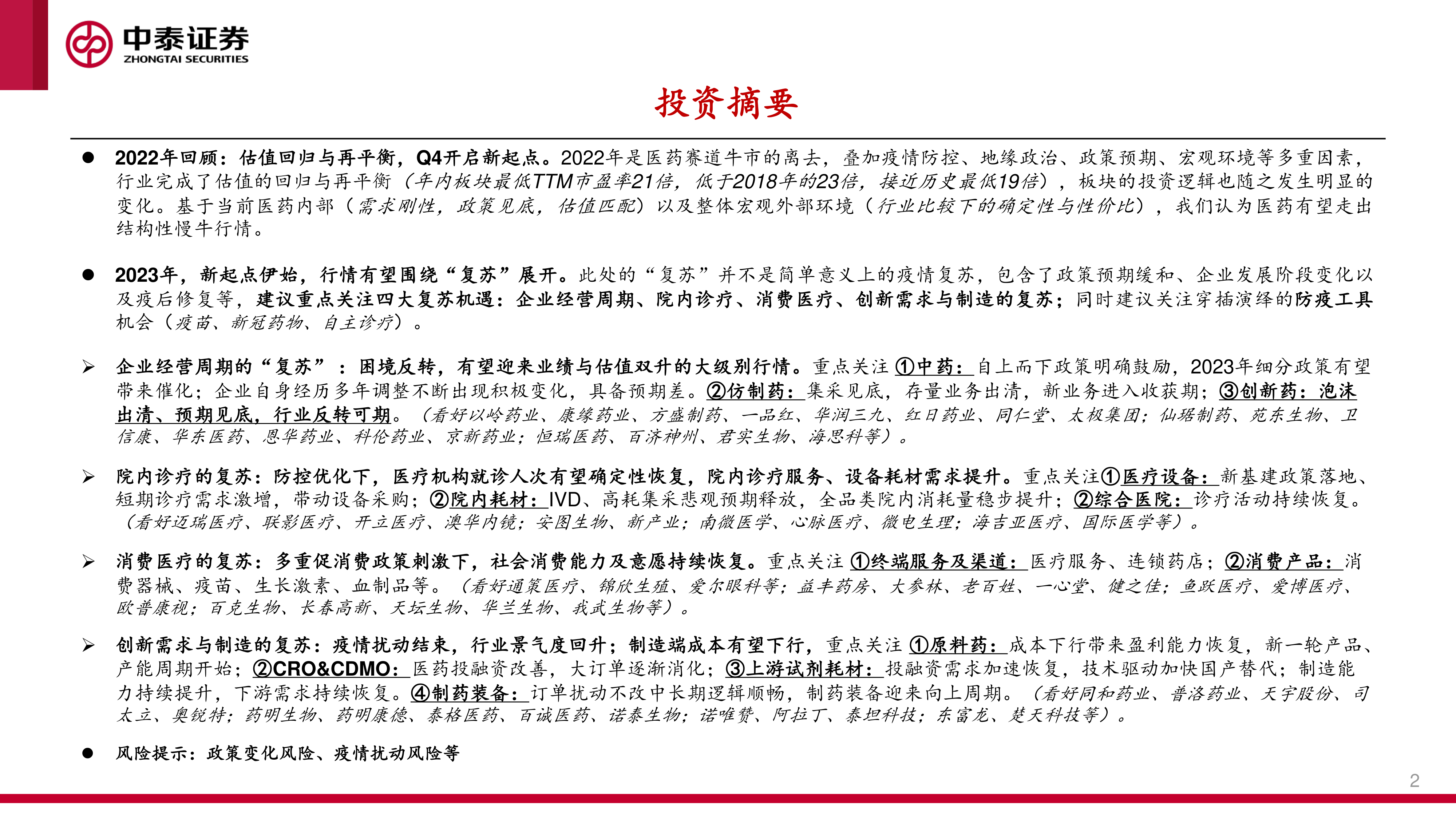 本报告对2022年医药行业进行了回顾,分析了估值回归、医保政策调整以及防疫政策变化对行业的影响。基于对国内外市场经验的总结,报告展望了2023年医药行业的四大复苏机遇,并对多个细分领域和相关公司进行了深入分析,提出了相应的投资建议。报告也指出了政策变化和疫情扰动等潜在风险。 投资者应根据自身风险承受能力和投资目标,谨慎决策。