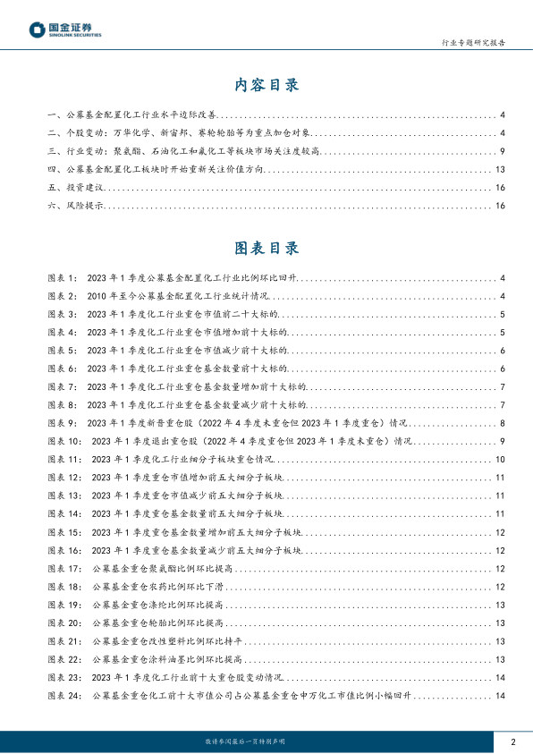 本报告基于2023年一季度公募基金对化工行业的配置数据,分析了化工行业投资现状及未来趋势。核心观点如下: