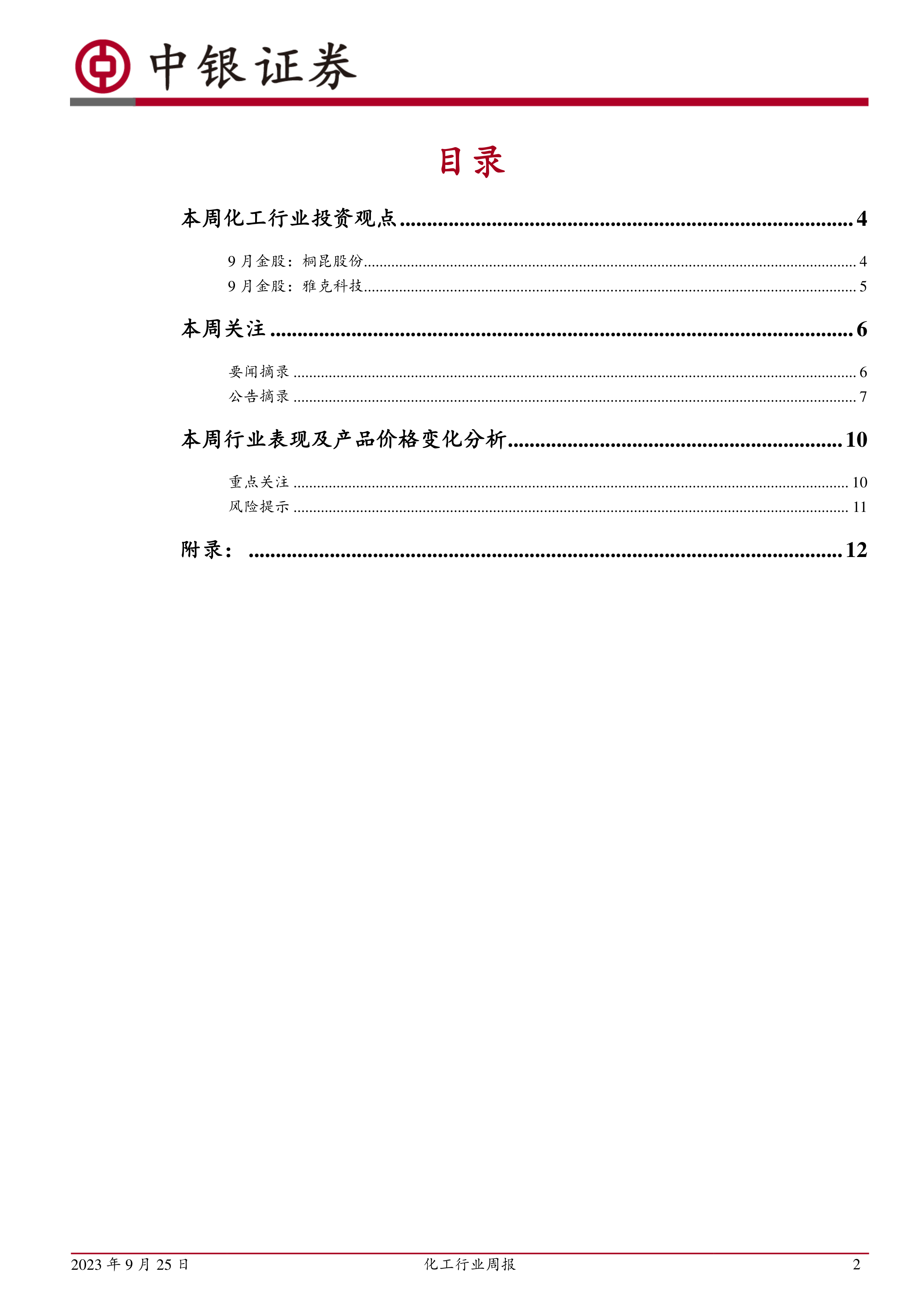 本报告的核心观点是:基础化工行业二季度环比改善不明显,但部分化工产品价格近期上涨,主要受库存低位、需求季节性旺盛以及企业联合控产稳价等因素影响。 未来,国内政策及传统旺季有望刺激需求回暖,对顺周期子行业持相对乐观态度。 投资建议方面,短期关注顺周期产业链低估值龙头公司、自主可控新材料及大型能源央企;长期关注龙头企业、民营石化公司、新材料国产替代及氟化工领域。