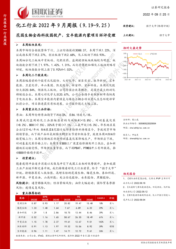 化工行业2022年9月周报:花园生物金西科技园投产,宝丰能源内蒙项目环评受理