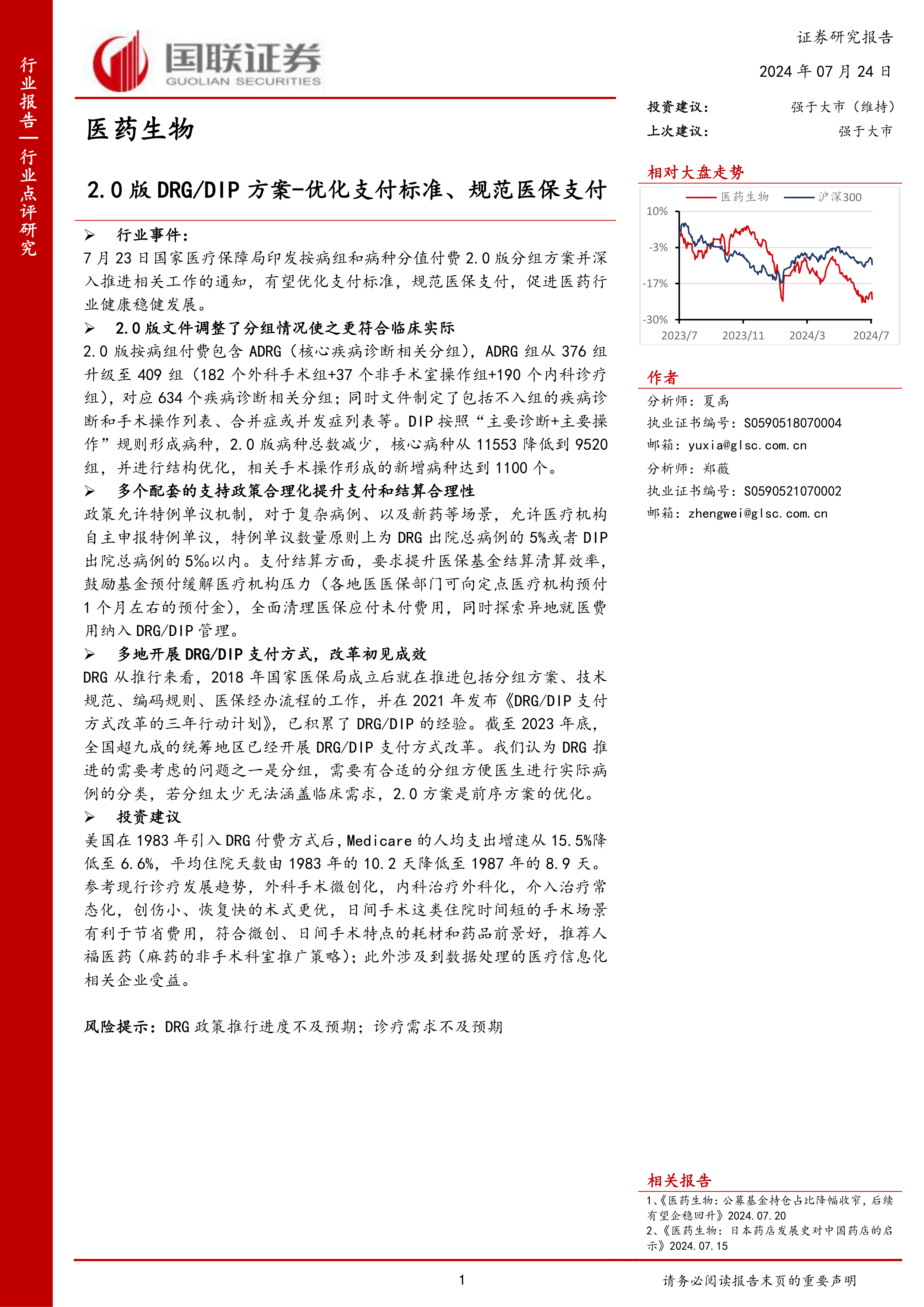 本报告深入分析了国家医疗保障局发布的DRG/DIP 2.0版分组方案,认为该方案的实施将优化支付标准,规范医保支付,促进医药行业健康稳健发展。方案的调整更符合临床实际,并辅以多个配套支持政策,提升了支付和结算的合理性。DRG/DIP改革在全国范围内的推广已初见成效,并为相关医疗信息化企业和符合微创、日间手术特点的耗材和药品企业带来机遇。报告最后维持医药生物行业“强于大市”的评级,并推荐了部分受益企业。 然而,报告也指出了DRG政策推行进度不及预期以及诊疗需求不及预期等风险提示。 投资者需谨慎评估自身风险承受能力,并结合自身情况进行投资决策。