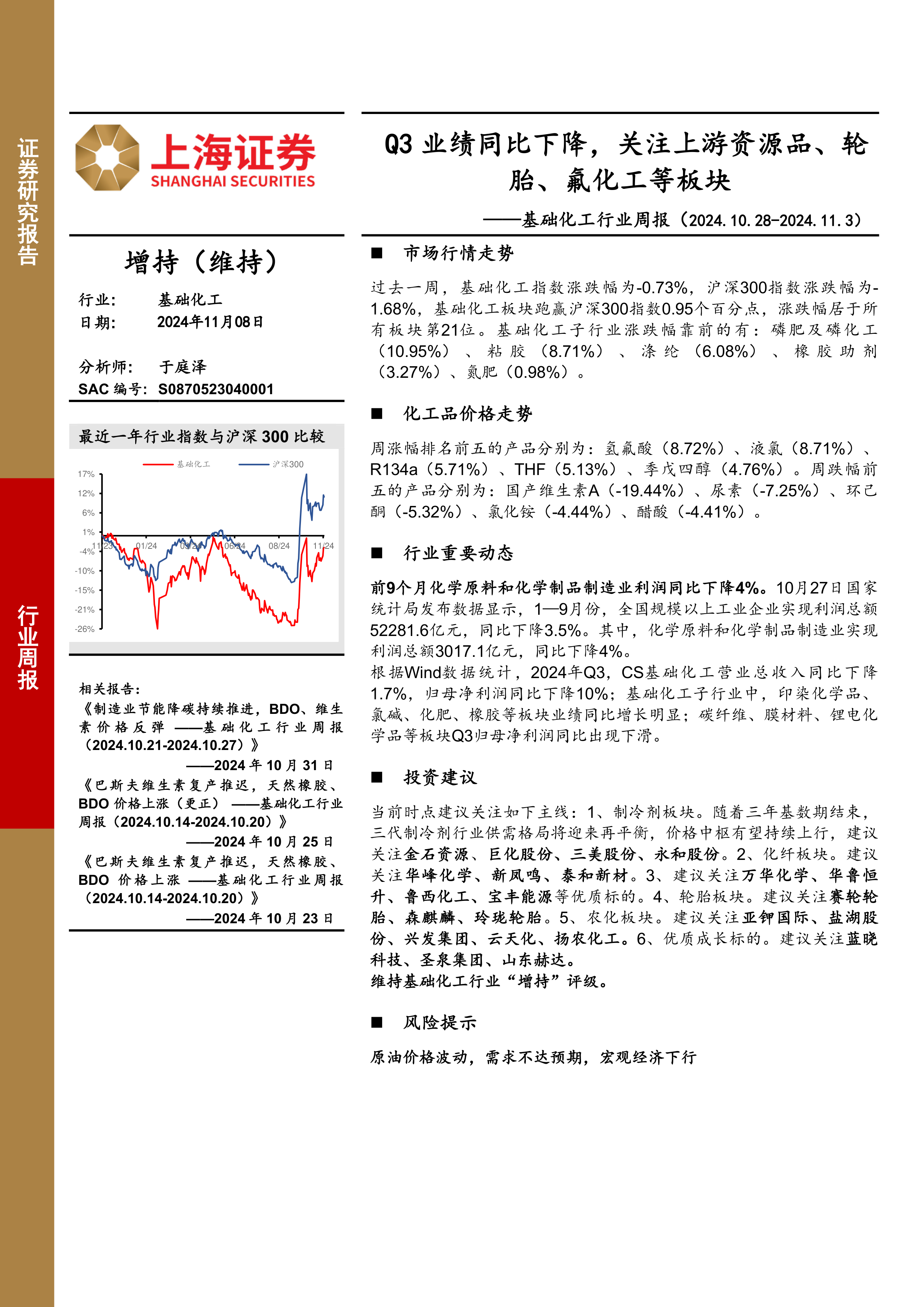 基础化工行业周报:Q3业绩同比下降,关注上游资源品、轮胎、氟化工等板块