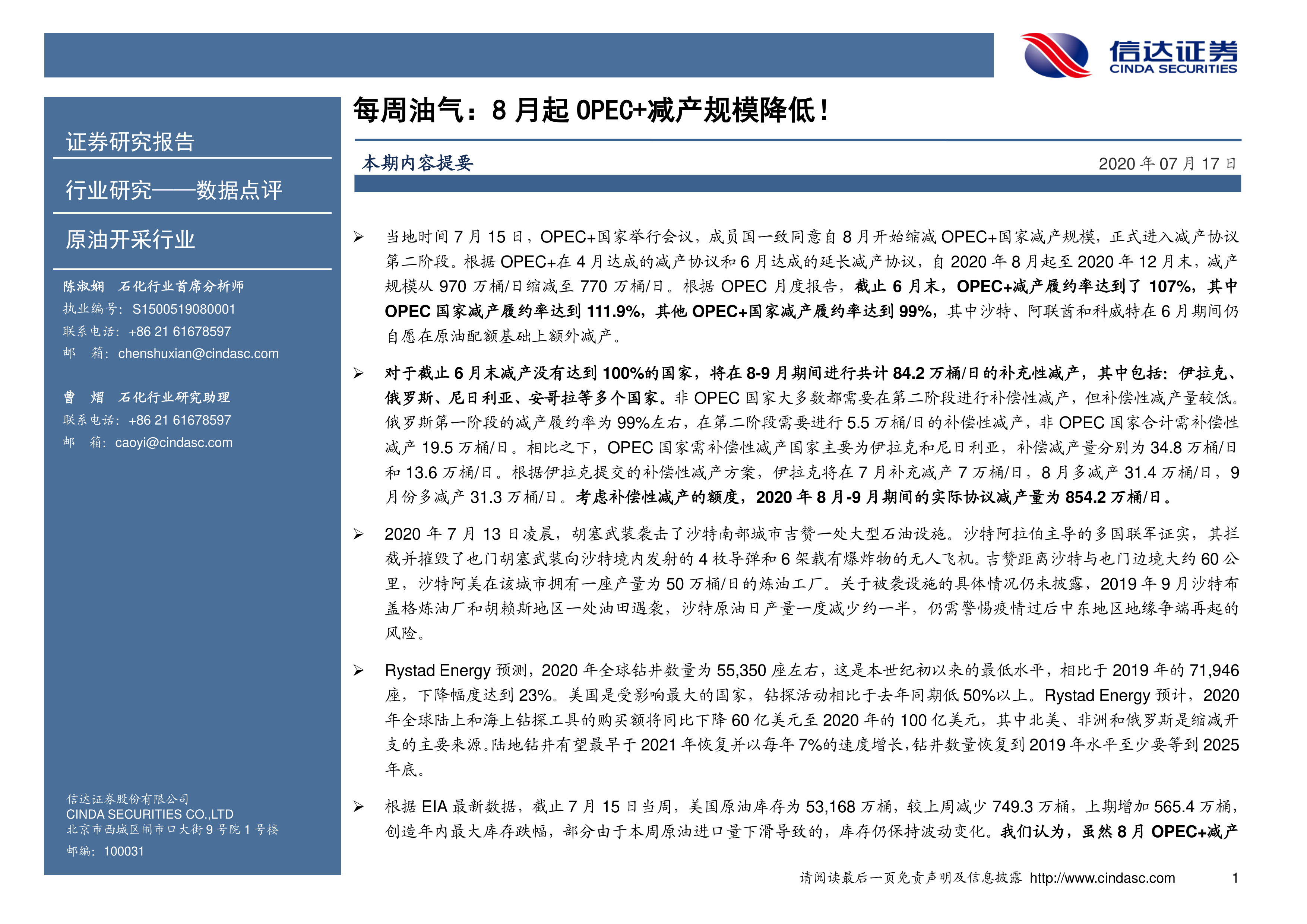 原油开采行业:每周油气:8月起OPEC+减产规模降低!