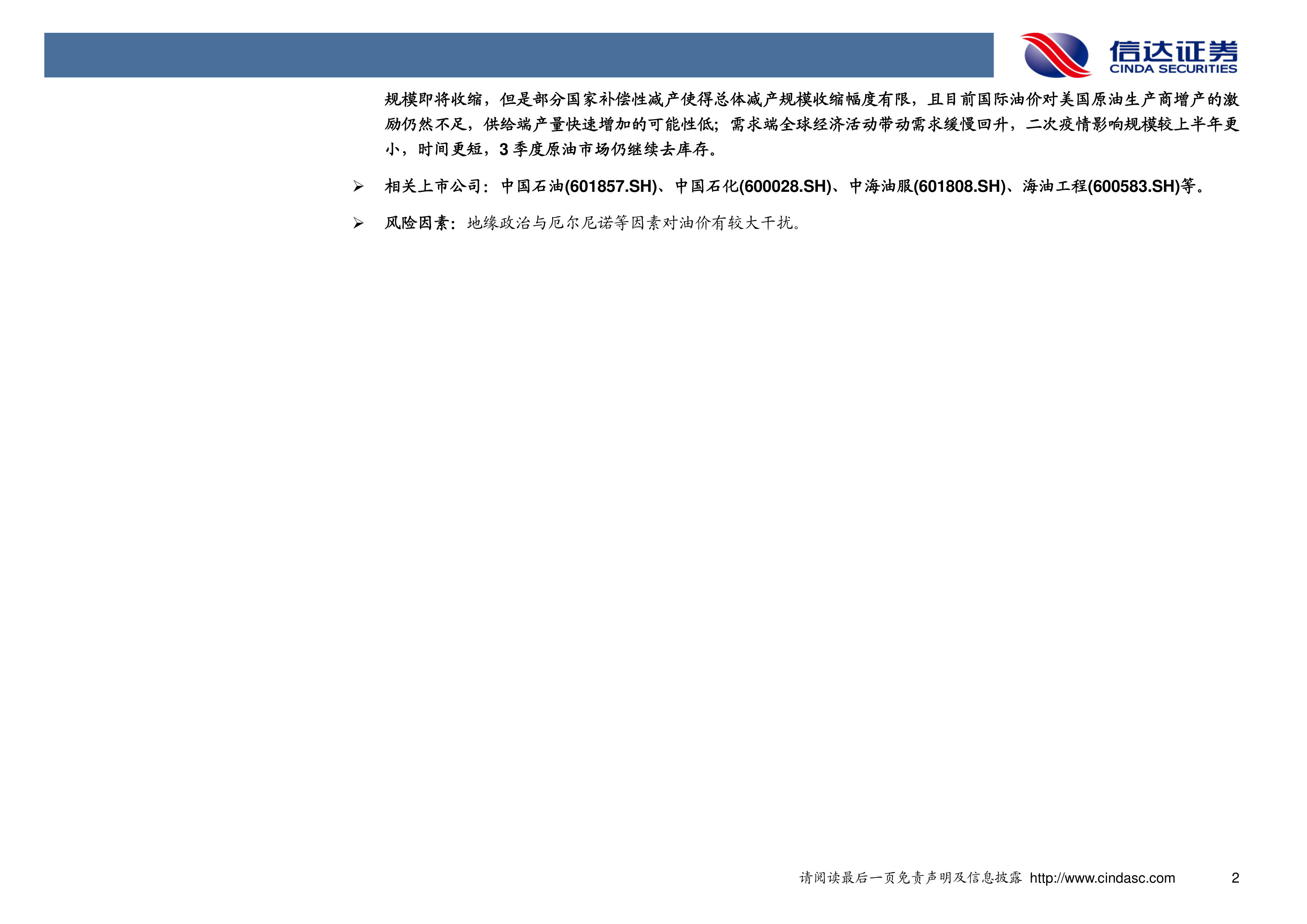 本报告的核心观点是:OPEC+自8月起将缩减减产规模,但部分成员国需进行补偿性减产,导致实际减产规模收缩幅度有限。同时,当前国际油价对美国原油生产商的增产激励不足,供给端增长缓慢;需求端则随全球经济活动缓慢复苏,预计三季度原油市场将继续去库存。
