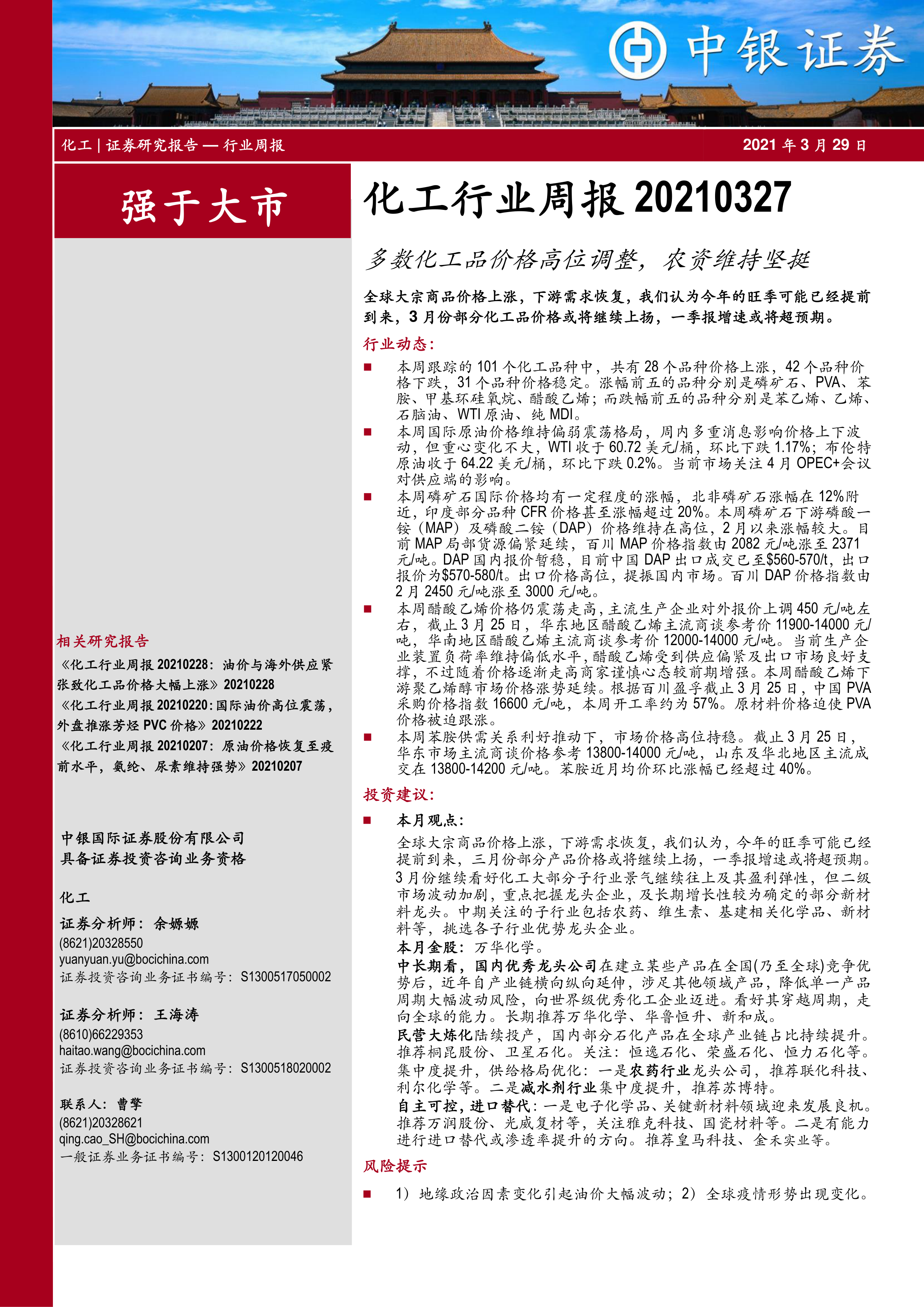 本报告基于对2021年3月化工行业周度数据的分析,指出全球大宗商品价格上涨和下游需求恢复导致化工行业旺季提前到来,部分化工产品价格持续上涨,一季度业绩增速有望超预期。报告建议投资者关注行业龙头企业和新材料龙头企业,并推荐了多只股票,但同时也提示了地缘政治风险和疫情变化等潜在风险。 报告中提供的图表数据对分析结论提供了有力支撑。 投资者应结合自身情况和风险承受能力,谨慎参考报告内容进行投资决策。