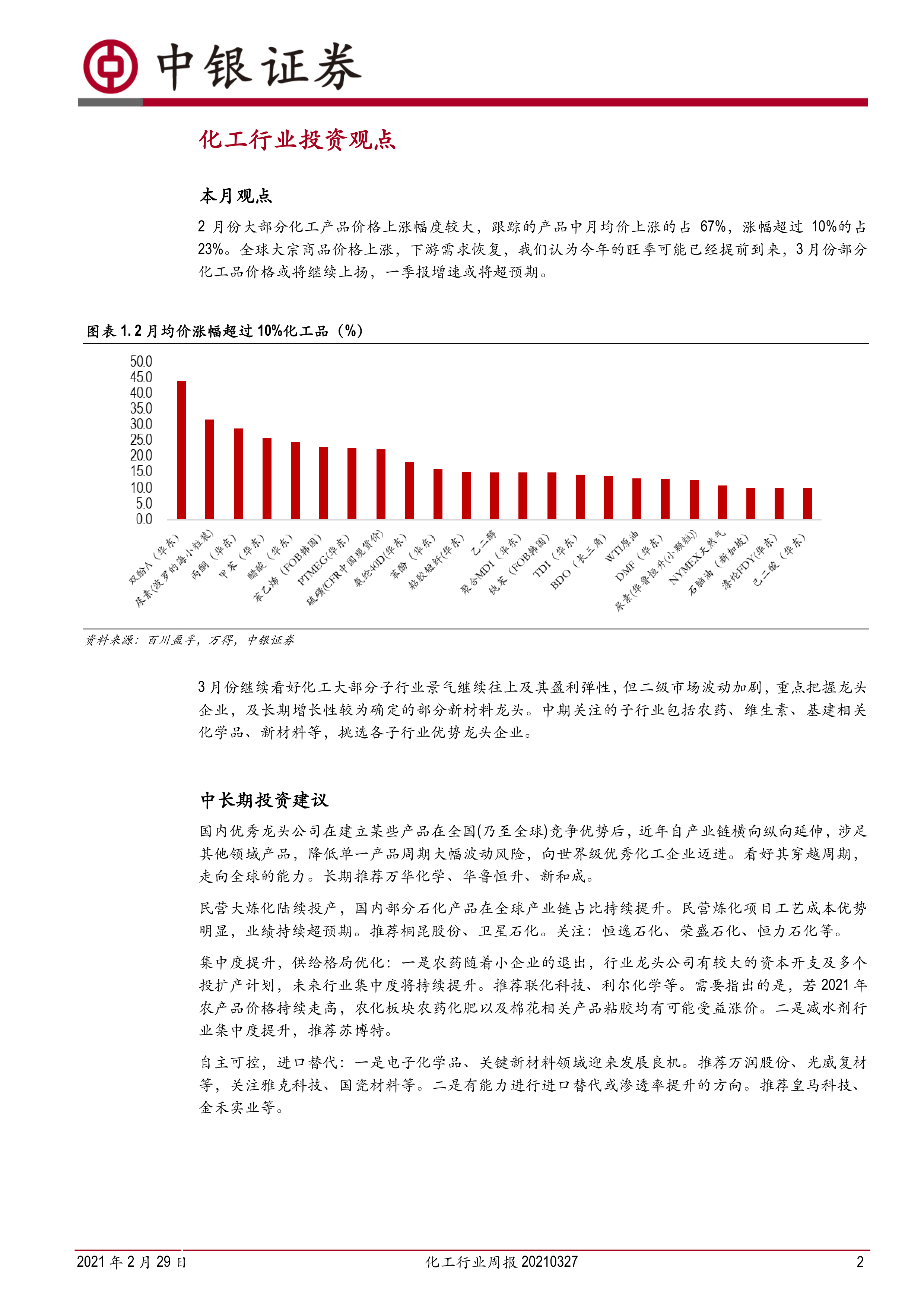 全球大宗商品价格上涨,下游需求恢复,我们认为,今年的旺季可能已经提前到来,三月份部分产品价格或将继续上扬,一季报增速或将超预期。3月份继续看好化工大部分子行业景气继续往上及其盈利弹性,但二级市场波动加剧,重点把握龙头企业,及长期增长性较为确定的部分新材料龙头。中期关注的子行业包括农药、维生素、基建相关化学品、新材料等,挑选各子行业优势龙头企业。