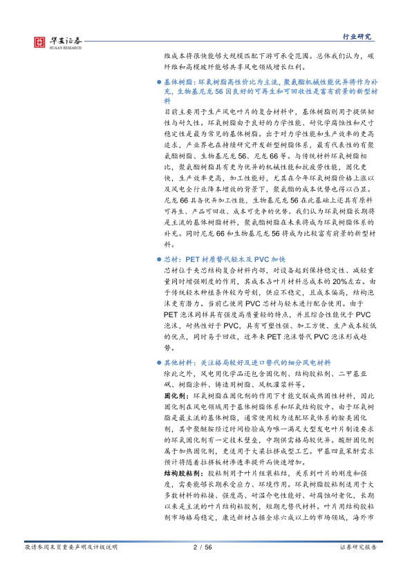 目前主要用于生产风电叶片的复合材料中,基体树脂则用于提供韧性与耐久性。环氧树脂由于良好的力学性能、耐化学腐蚀性和尺寸稳定性是最为常见的基体树脂。出于对力学性能和生产效率的更高追求,产业界也在持续研究开发新型树脂体系,最有代表性的有聚氨酯树脂、生物基尼龙56、尼龙66等。与传统材料环氧树脂相比,聚氨酯树脂具有更为优异的机械性能和抗疲劳性能,固化更快,生产效率更高,加工性能好,尤其在今年环氧树脂价格上涨以及风电全行业降本增效的背景下,聚氨酯的成本优势也得以凸显。尼龙66具备优异加工性能,生物基尼龙56在此基础上还具有原料可再生、产品可回收、成本可竞争的优势。我们认为环氧树脂长期将是主流的基体树脂材料,聚氨酯树脂在未来将成为环氧树脂体系的补充。同时尼龙66和生物基尼龙56将成为比较富有前景的新型材料。芯材:PET材质替代轻木及PVC加快芯材位于夹芯结构复合材料内部,对设备起到保持稳定性、减轻重量同时增强刚度的作用,其成本占叶片材料总成本的20%左右。由于传统轻木种植条件较为苛刻,供应不稳定,且成本偏高,结构泡沫更有潜力。当前已使用PVC芯材与轻木进行配合使用。由于PET泡沫同样具有强度高质量轻的特点,并且综合性能优于PVC泡沫,耐热性好于PVC,具有可塑性强、加工方便、生产成本较低的优点,同时易于回收,近年来PET泡沫替代PVC泡沫形成趋势。