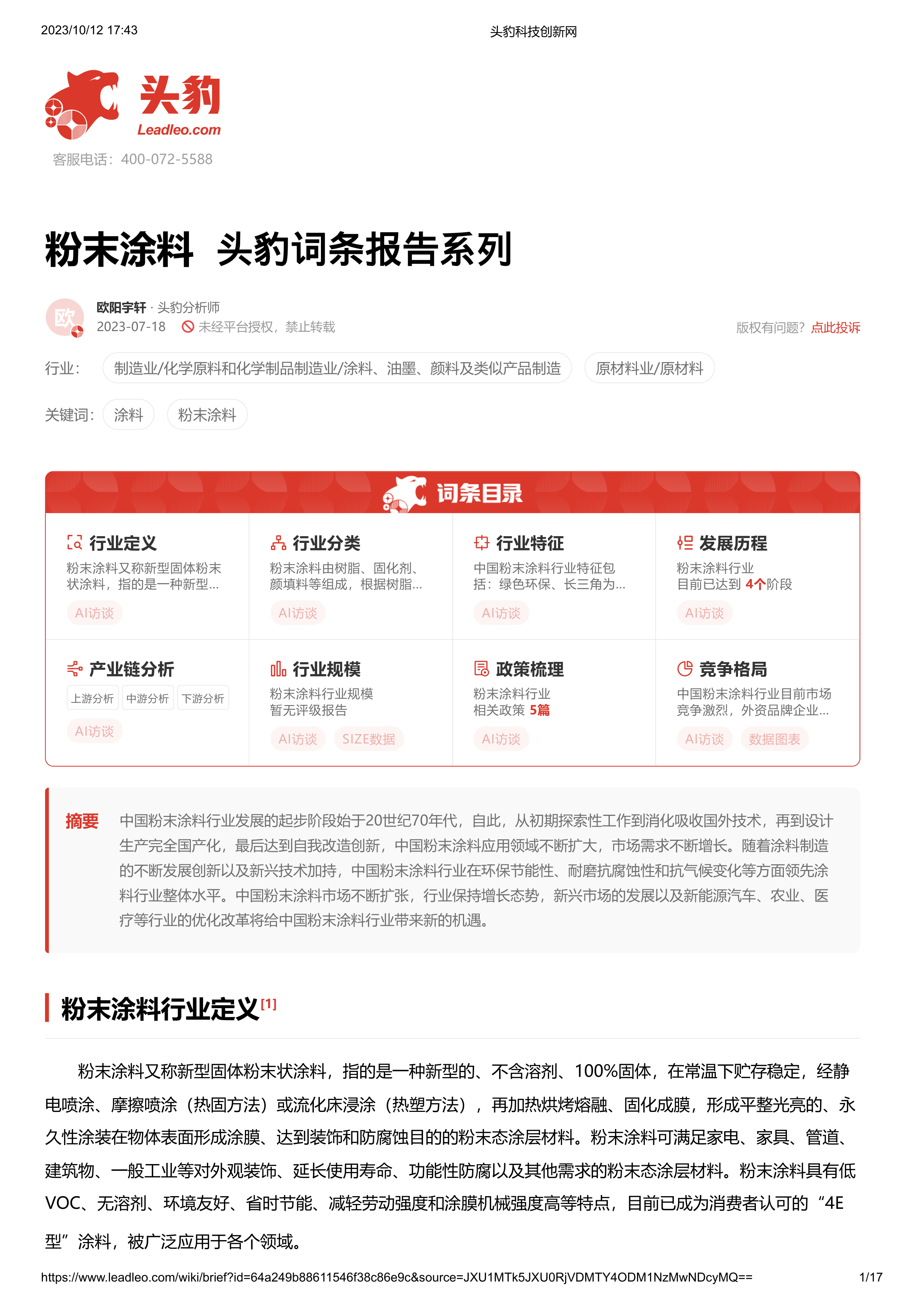 本报告基于头豹研究院发布的《粉末涂料行业深度报告》,运用统计数据和市场分析,对中国粉末涂料行业进行全面解读。报告核心观点如下: