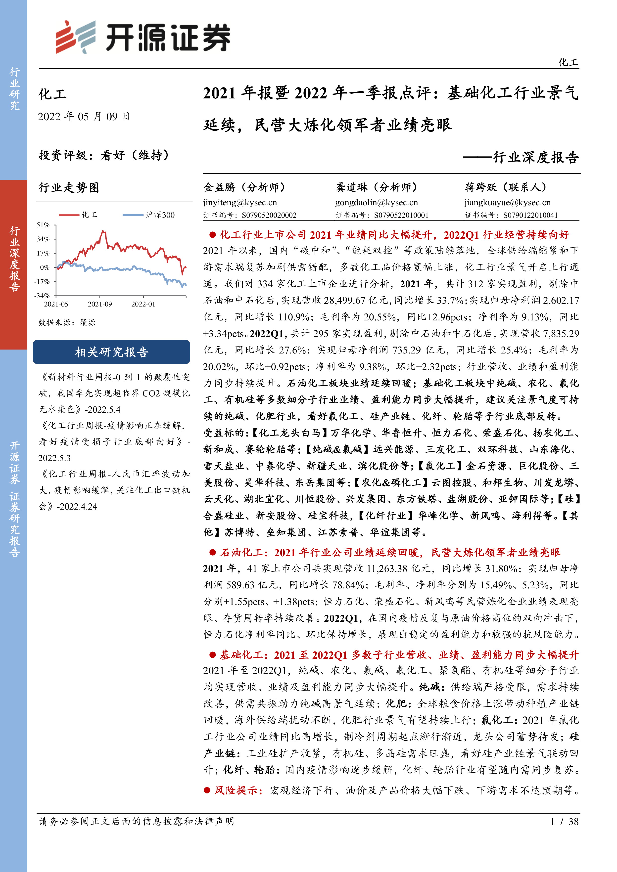 化工行业深度报告:2021年报暨2022年一季报点评:基础化工行业景气延续,民营大炼化领军者业绩亮眼