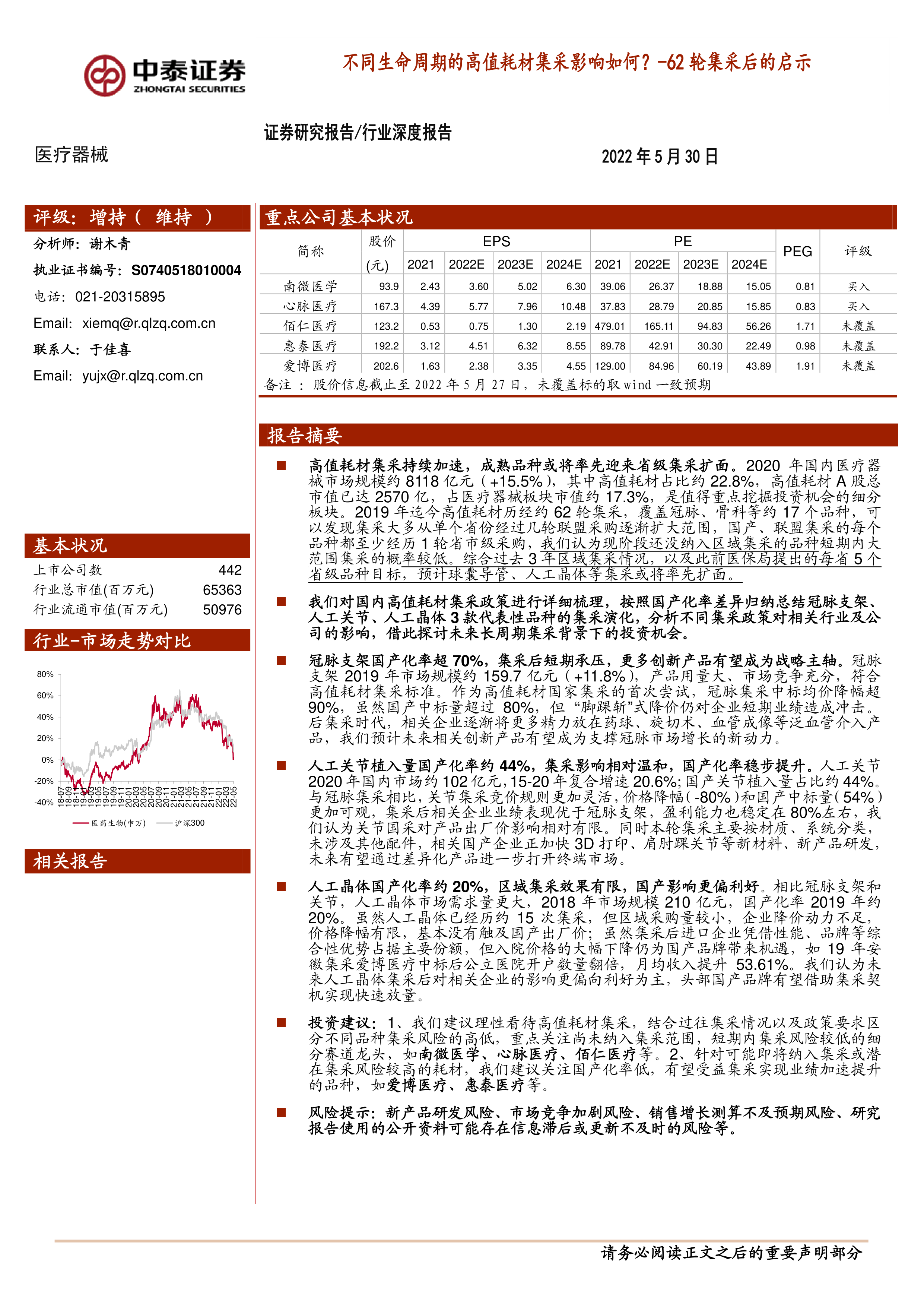 报告最后给出了投资建议:关注短期集采风险低的细分赛道龙头企业(如南微医学、心脉医疗、佰仁医疗等),以及国产化率低、有望受益集采的品种(如爱博医疗、惠泰医疗等)。 同时,报告也提示了新产品研发风险、市场竞争加剧风险、销售增长测算不及预期风险以及信息滞后风险等。