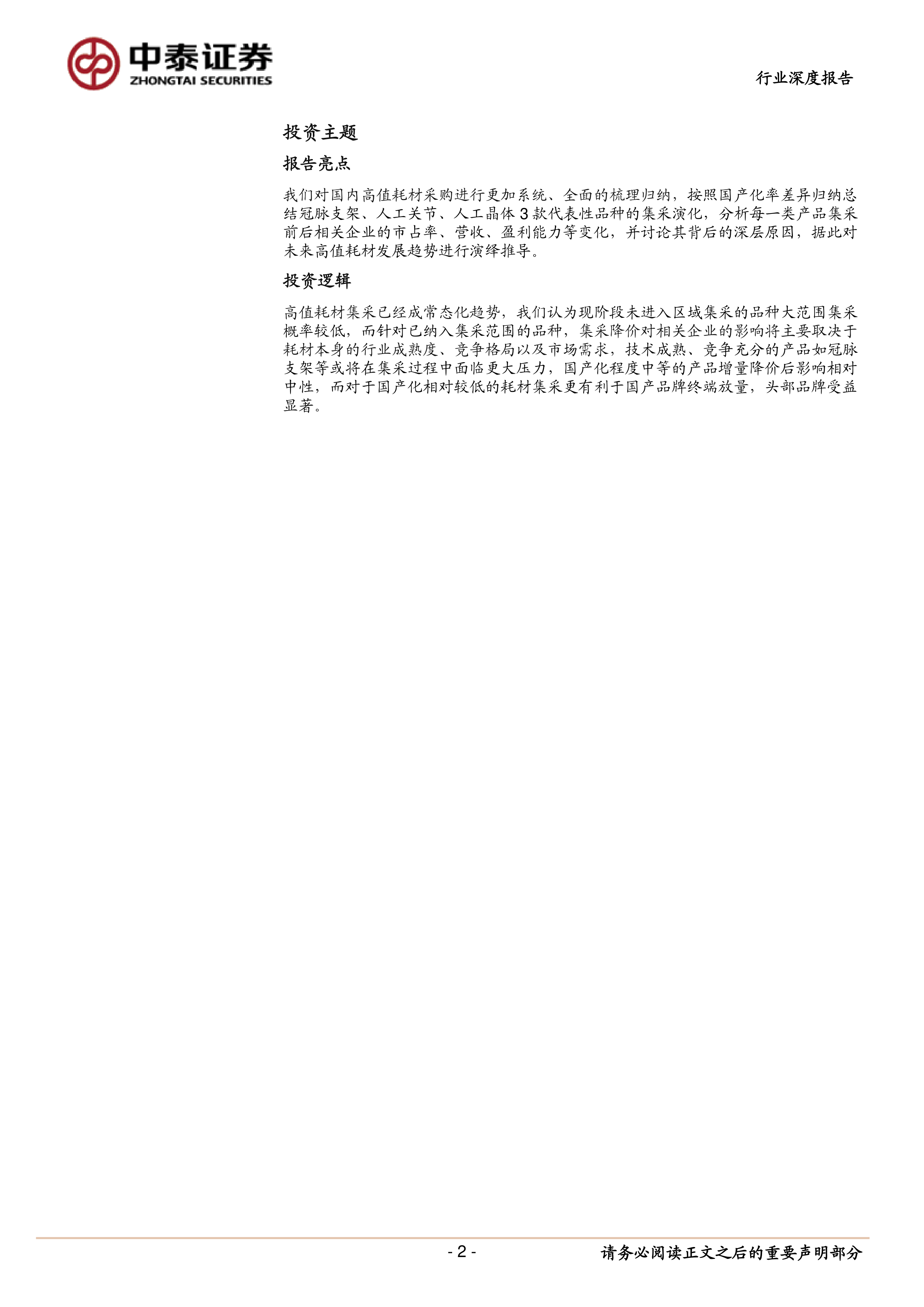 本报告的核心观点是:高值耗材集采已成为常态化趋势,其对不同品种的影响程度取决于耗材的成熟度、竞争格局和国产化率。 成熟、竞争充分的品种(如冠脉支架)集采后短期承压,但创新产品有望成为新的增长点;国产化率中等的产品(如人工关节)集采影响相对温和,国产占比稳步提升;国产化率低的品种(如人工晶体)集采对国产企业更偏利好,有望加速放量。 投资者应理性看待集采风险,关注不同品种的差异化投资机会。