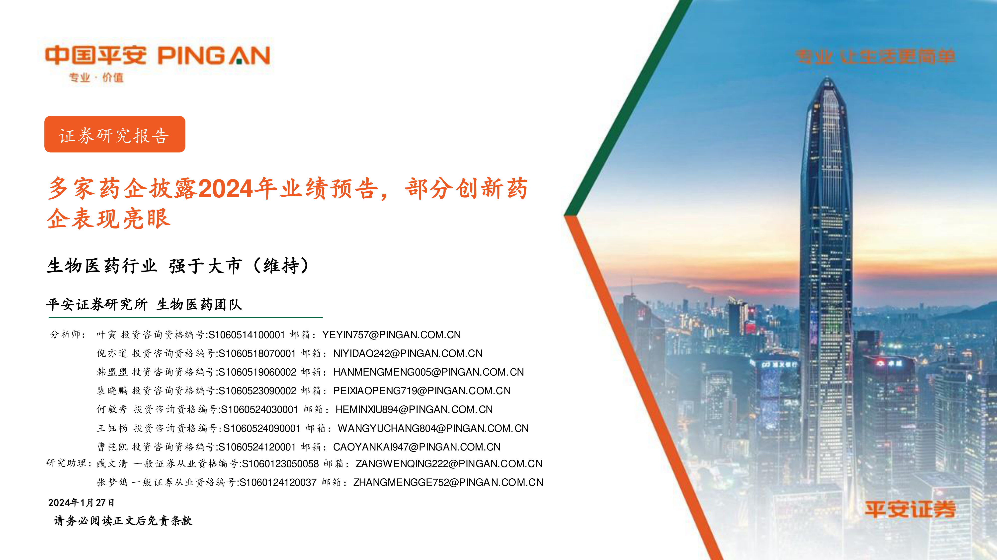 生物医药行业:多家药企披露2024年业绩预告,部分创新药企表现亮眼