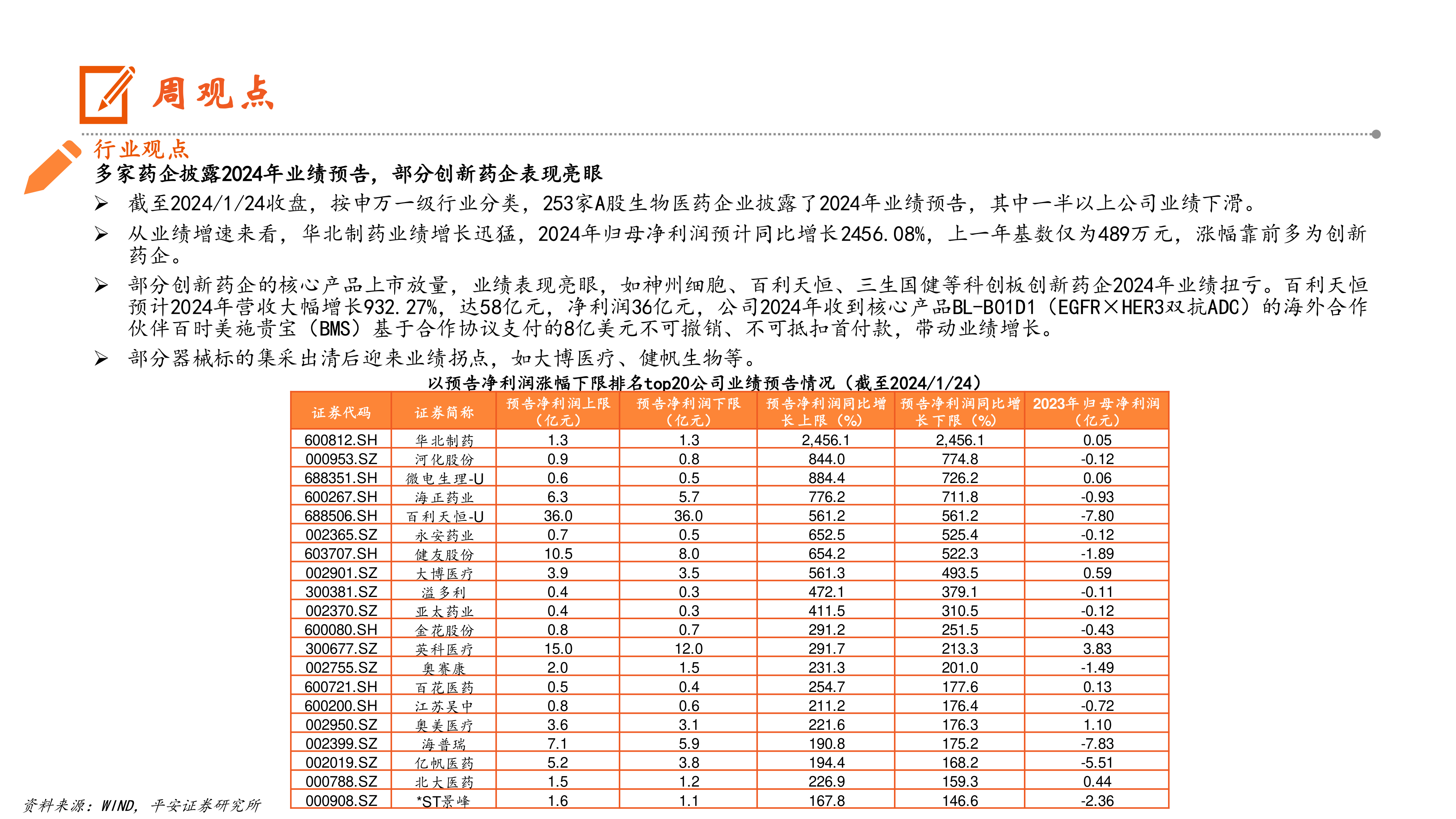 报告基于截至2024年1月24日的数据,分析了253家A股生物医药企业披露的2024年业绩预告。数据显示,行业整体业绩表现分化严重,一半以上公司业绩下滑。 以预告净利润涨幅下限排名top20的公司为例,其业绩增速差异巨大,华北制药以2456.08%的同比增长率位居榜首,而其他公司则呈现出不同程度的增长或下滑。 这进一步佐证了行业内部的显著分化。