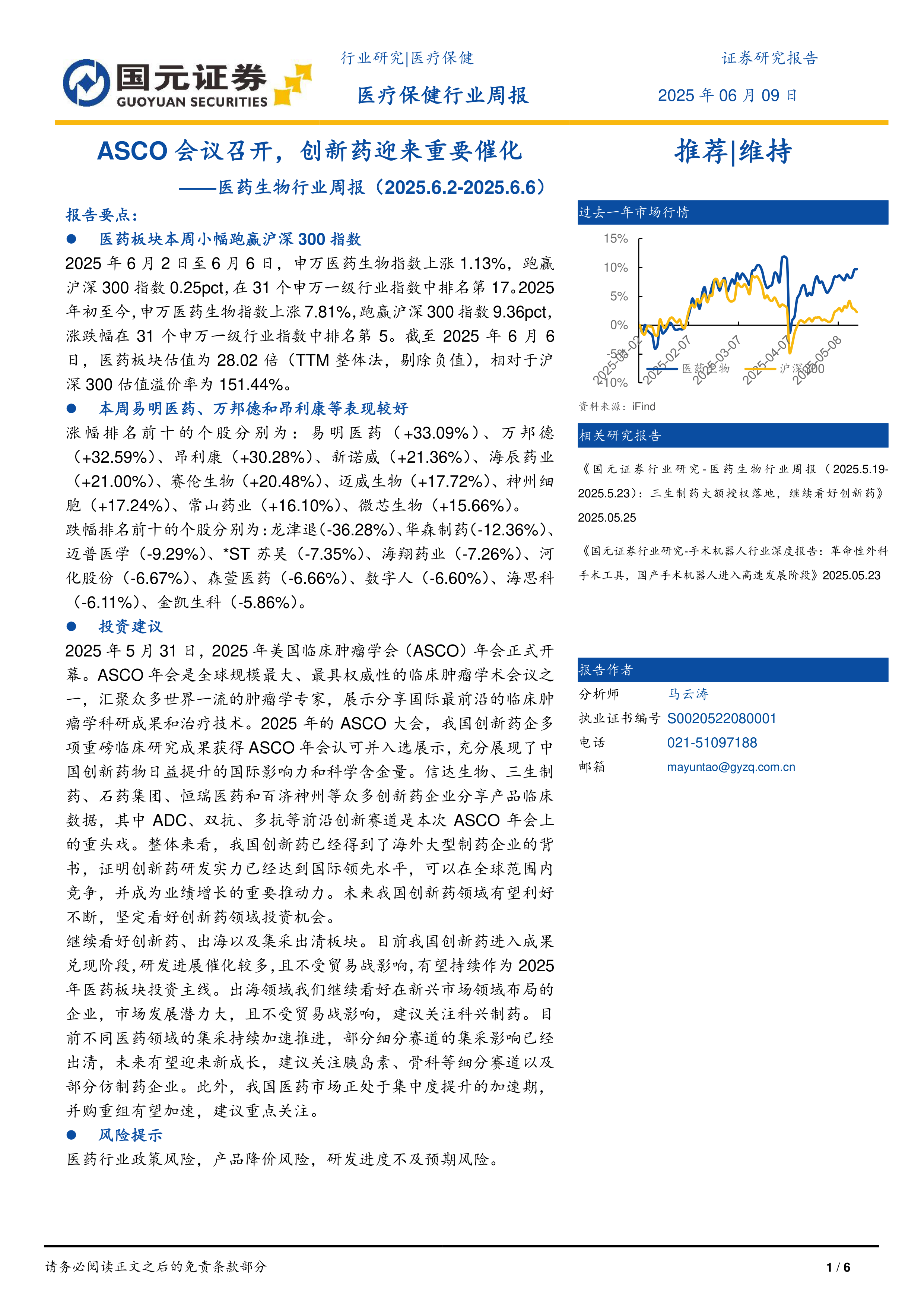 本报告通过对2025年6月2日至6月6日医药板块市场行情的回顾,以及对2025年ASCO年会等重要事件的分析,得出中国创新药发展前景广阔的结论。报告建议投资者继续关注创新药、出海和集采出清板块的投资机会,但同时也需要警惕医药行业政策风险、产品降价风险和研发进度不及预期风险。 报告数据翔实,分析客观,为投资者提供了有价值的参考信息。 需要注意的是,报告中提到的投资建议仅供参考,不构成投资建议,投资者应根据自身情况做出投资决策。